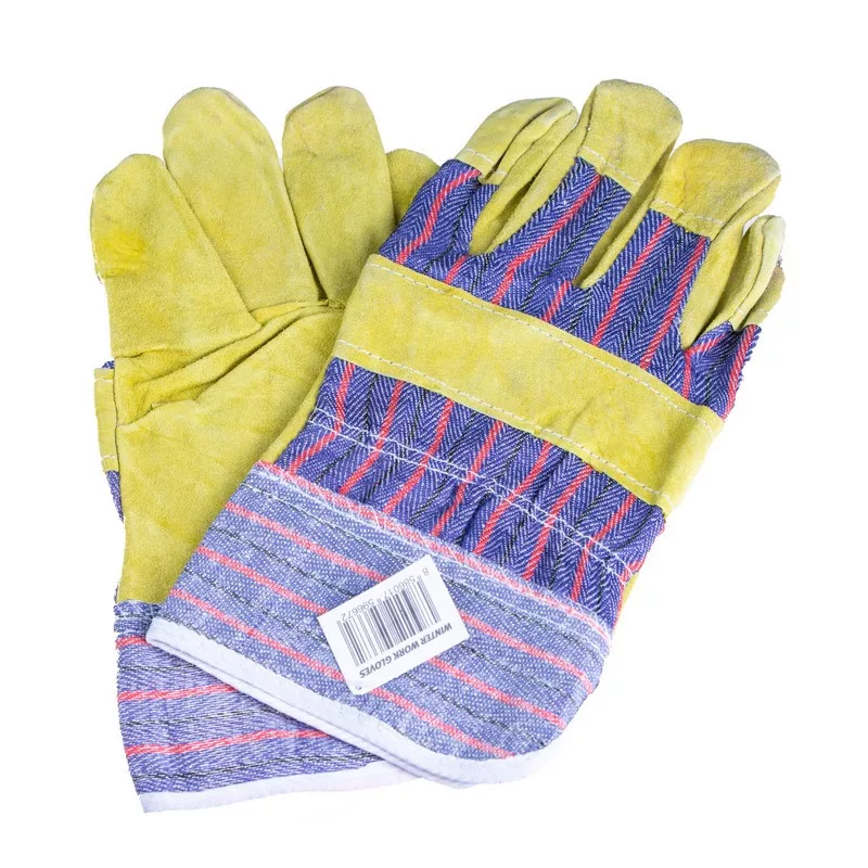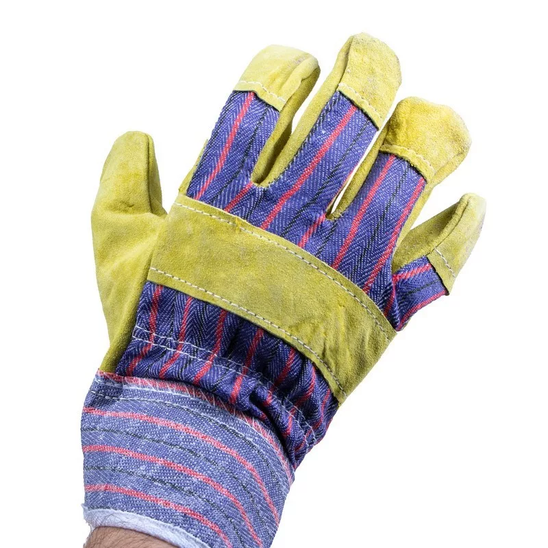 Kombinált védőkesztyű hasított marhabőrből, bélelt tenyérrel, a kézfej és a mandzsetta vászonból.