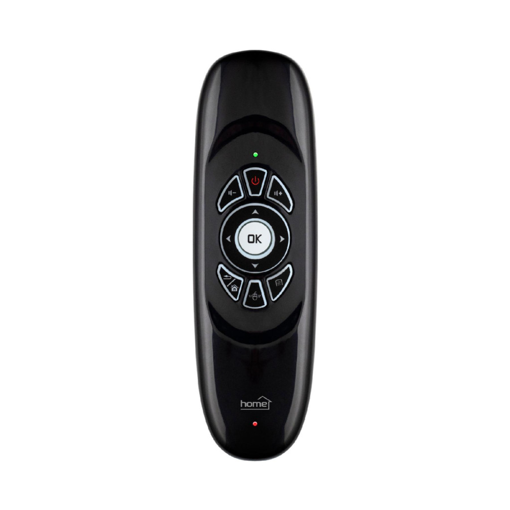 A Home URCAIR2 SMART távirányító kompatibilis az okos TV-kkel, TV box-okkal, média lejátszókkal, játék konzolokkal, projektorokkal, számítógépekkel, notebookokkal, mini PC-kkel, táblagépekkel és okostelefonokkal. A beépített háromtengelyes giroszkóp mozgásérzékelő pontos és könnyű irányítást biztosít. Az angol QWERTY billentyűzet 46+11 gombja hét különböző színben világít, így sötétben is egyszerű a használat.