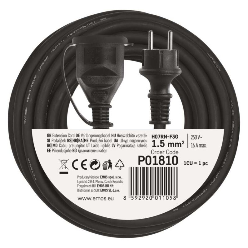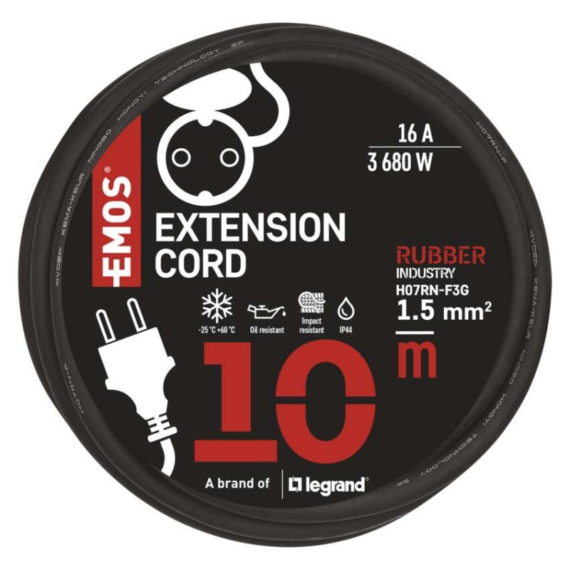 aljzatok száma: 1|áramerősség: 16 A|egyéb funkciók: nem|értékesítési csomagolás: 1 db, fólia|feszültség: 230 V|garancia-időszak: 2 év|gyerekzár: igen|hőkioldó biztosíték: nem|hossz: 10 m|max. terhelés feltekerve: nincs megadva|max. terhelés szétbontva: 16 A max./3 680 W|méretek: nincs megadva|súly: nincs megadva|szigetelés típusa: gumi/neopren|szín: fekete|termék: hosszabbito eloszto - toldó|védettség: IP44|vezeték: H07RN-F3G|vezeték keresztmetszet: 1,5 mm²