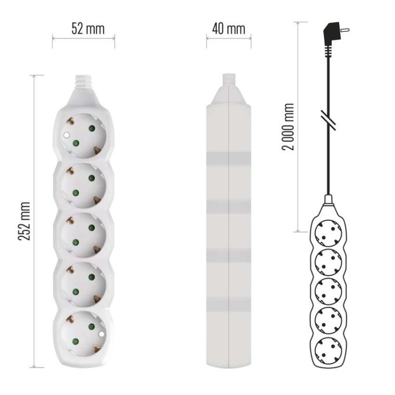 aljzatok száma: 5× 2P + PE SCHUKO|alkalmazási nyelvek: –|az aljzatok és dugók anyaga: műanyag|egyéb funkciók: nem|értékesítési csomagolás: 1 db, akasztható|értesítések a mobilalkalmazáshoz: nem|feszültség/áram: 250 V~/16 A max.|gyerekzár: igen|hangalapú asszisztensek általi vezérlés: nem|hossz: 2 m|jelátviteli frekvencia: –|kapcsoló: nem|kompatibilitás: –|max. terhelés: 3 680 W|protokoll: –|szigetelés típusa: PVC|szín: fehér|támogatott OS: –|USB kimenet: nem|vezeték: H05VV-F3G 1,0 mm²