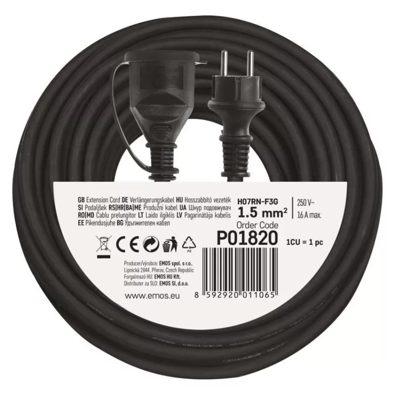 aljzatok száma: 1|áramerősség: 16 A|egyéb funkciók: nem|értékesítési csomagolás: 1 db, fólia|feszültség: 230 V|garancia-időszak: 2 év|gyerekzár: igen|hőkioldó biztosíték: nem|hossz: 20 m|max. terhelés feltekerve: nincs megadva|max. terhelés szétbontva: 16 A max./3 680 W|méretek: nincs megadva|súly: nincs megadva|szigetelés típusa: gumi/neopren|szín: fekete|termék: hosszabbito eloszto - toldó|védettség: IP44|vezeték: H07RN-F3G|vezeték keresztmetszet: 1,5 mm²