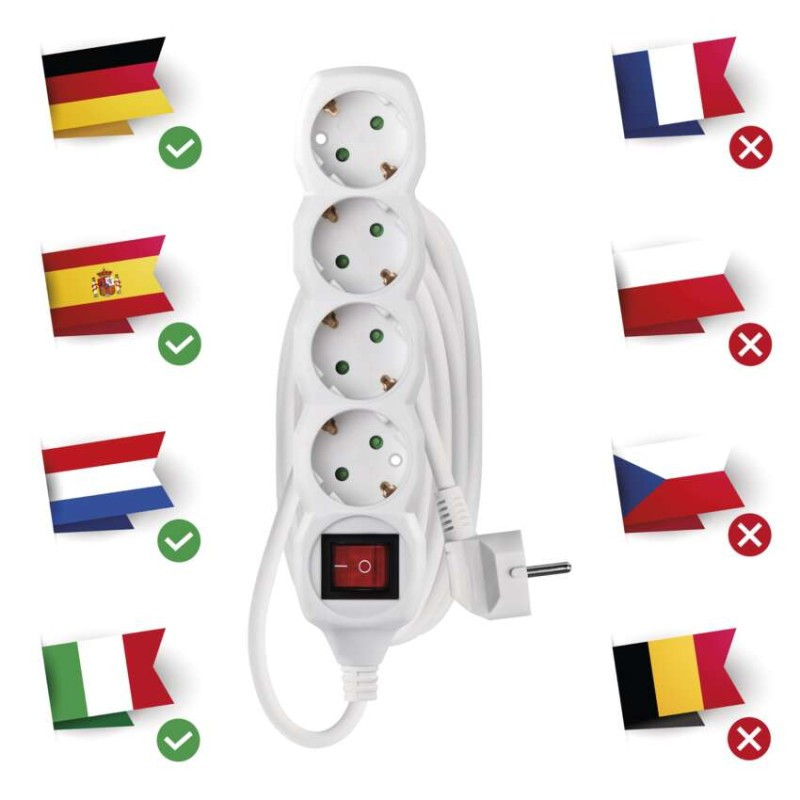aljzatok száma: 4× 2P + PE SCHUKO|az aljzatok és dugók anyaga: műanyag|értékesítési csomagolás: 1 db, akasztható|feszültség/áram: 250 V~/16 A max.|gyerekzár: igen|hossz: 3 m|kapcsoló: igen|max. terhelés: 3 680 W|szigetelés típusa: PVC|szín: fehér|USB kimenet: nem|vezeték: H05VV-F3G 1,5 mm²