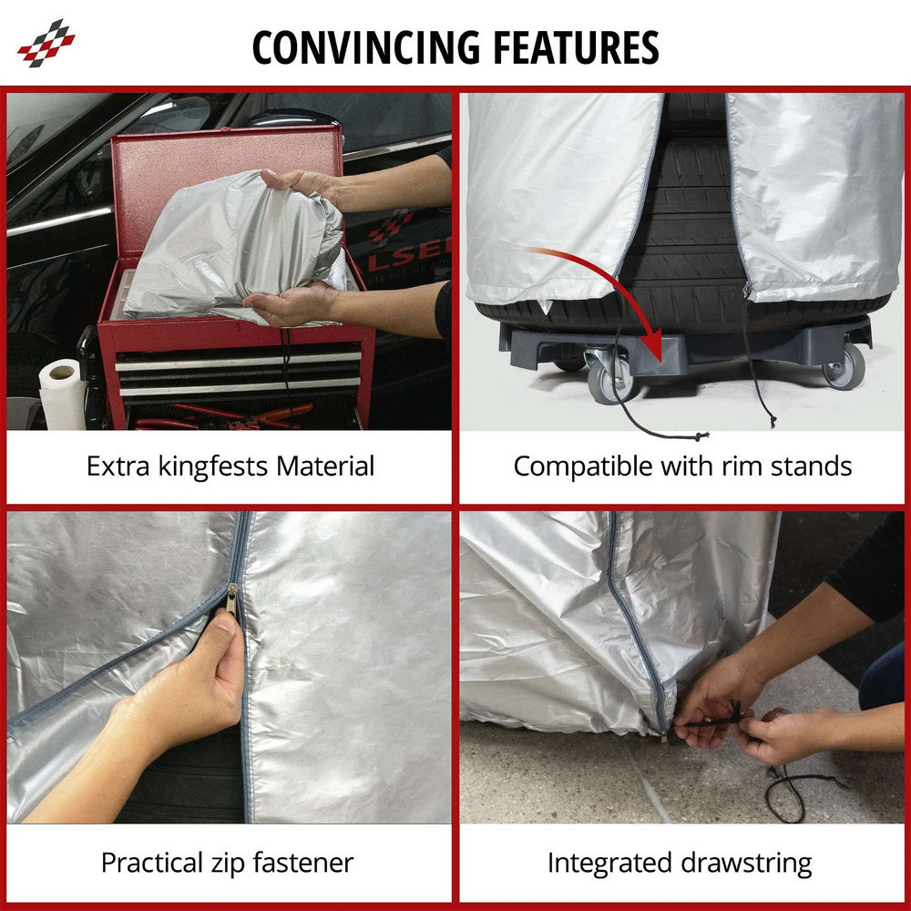 A négy gumiabroncsnak való gumiabroncs táska vízlepergető, ezüstbevonatú anyagból készült, amely különösen robusztus. Ez azt jelenti, hogy a gumiabroncsok jól be vannak fedve a tárolás során, ideálisan védve vannak a szennyeződéstől és a nedvességtől. Ezenkívül a táska védi a tárolóhely körüli felületeket is, például a csúnya fekete csíkoktól vagy a falon lévő karcolásoktól.