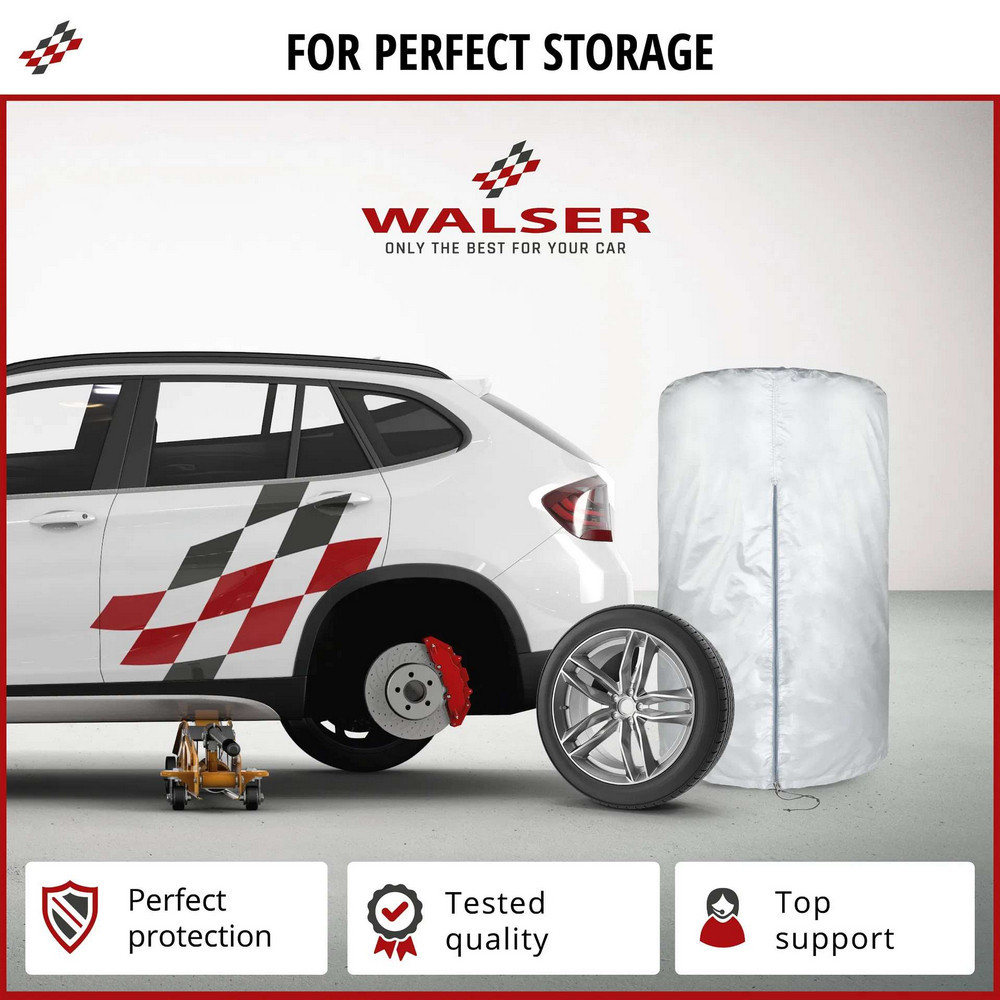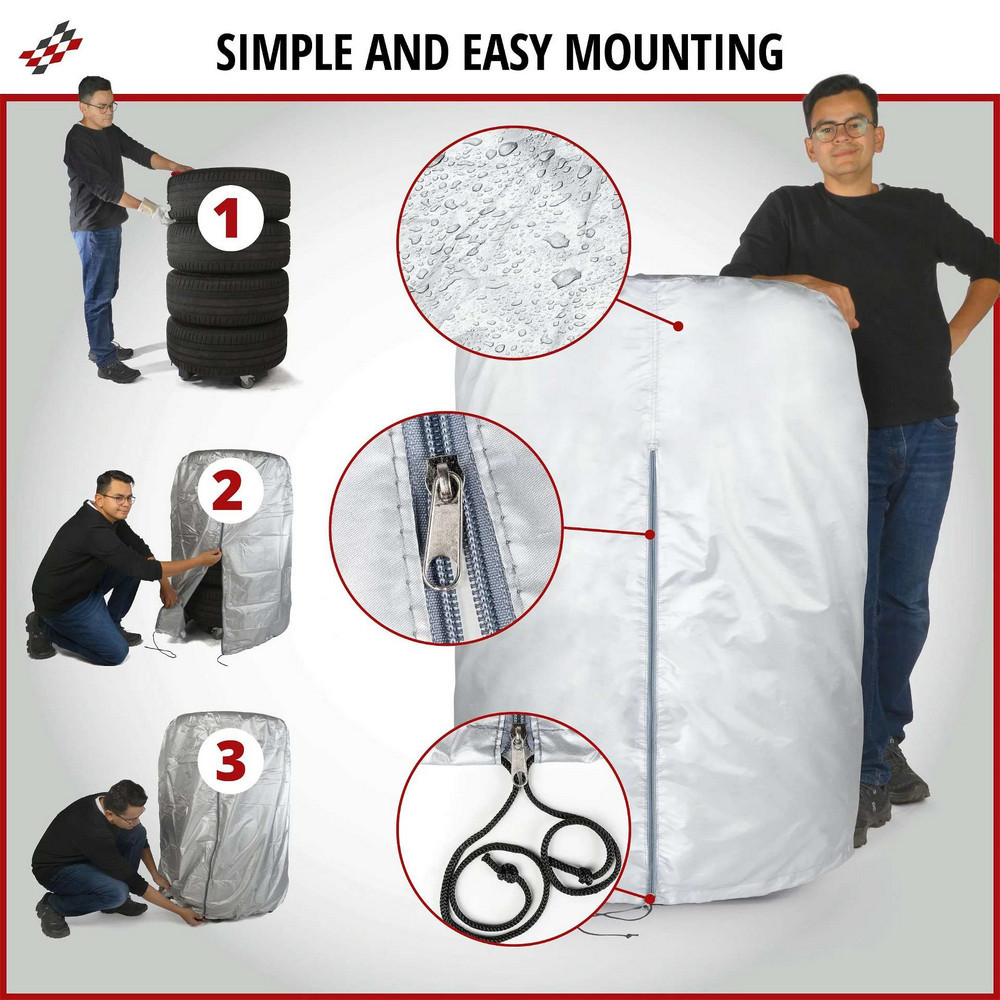 A gumiabroncs táska könnyen használható cipzárral rendelkezik, amely az egyik oldalon teljesen kinyílik. Ezután a táskát egyszerűen át kell húzni a gumiabroncsra, majd le kell zárni a cipzárral. A táska felniállványon tárolt gumikhoz is használható. Az alján egy további húzózsinór található, amely alul szorosan összehúzza. Ennek eredményeként a gumiabroncsok jól védettek a por és egyéb anyagok behatolásával szemben, a következő cserénél pedig szinte azonnal használatra készek.