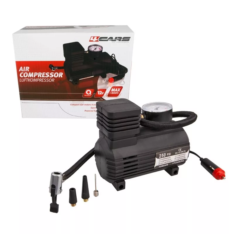 12V-ról üzemeltethető, szivargyújtó csatlakozási lehetőséggel rendelkező kompresszor, manométerrel.