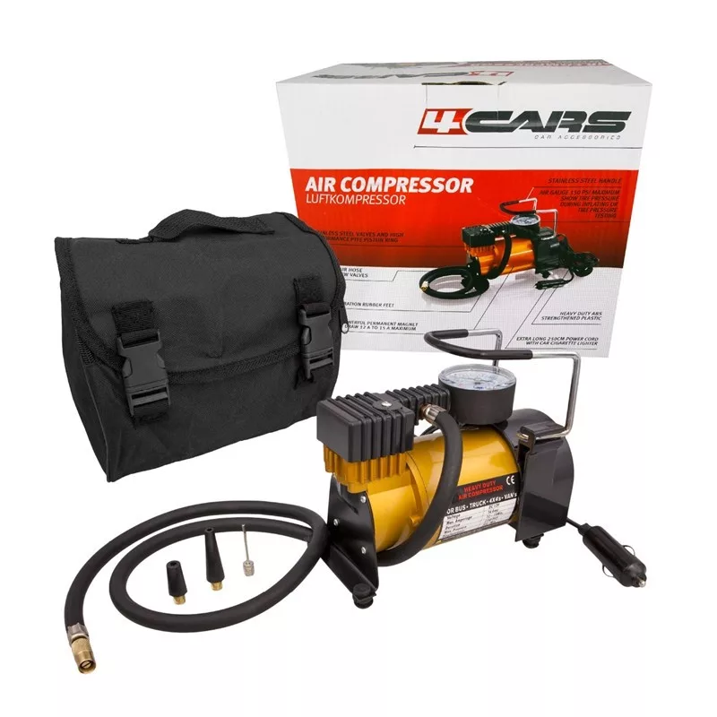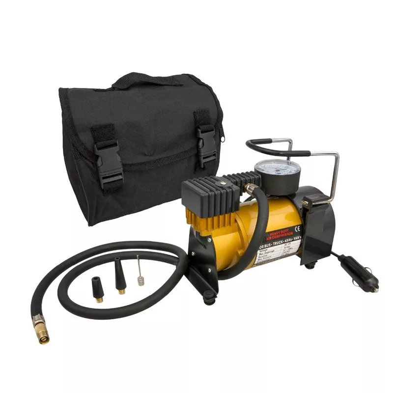 12V-ról üzemeltethető, szivargyújtó csatlakozási lehetőséggel rendelkező kompresszor, manométerrel.