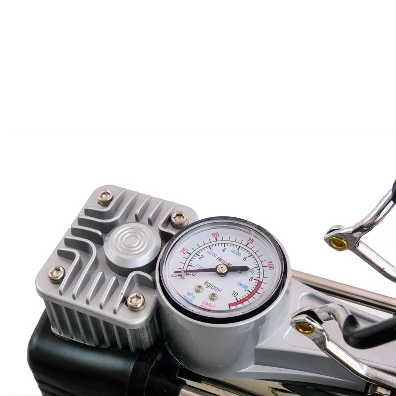 12V-ról üzemeltethető, szivargyújtó csatlakozási lehetőséggel rendelkező kompresszor, manométerrel.