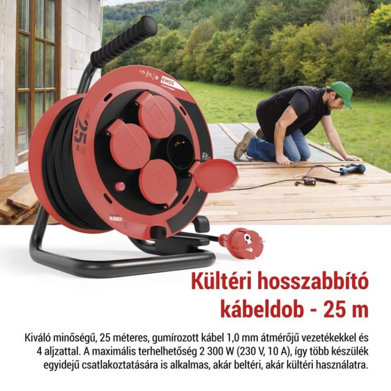 Kültéri kábeldob 25 m / 4 aljzat / fekete / gumi / 230V/400V / 1,0 mm2