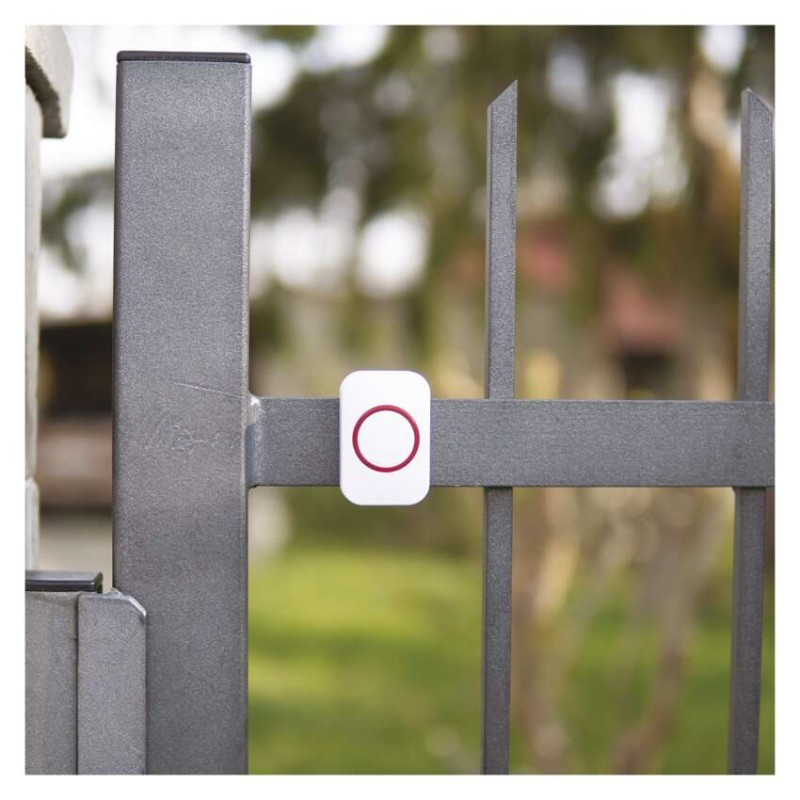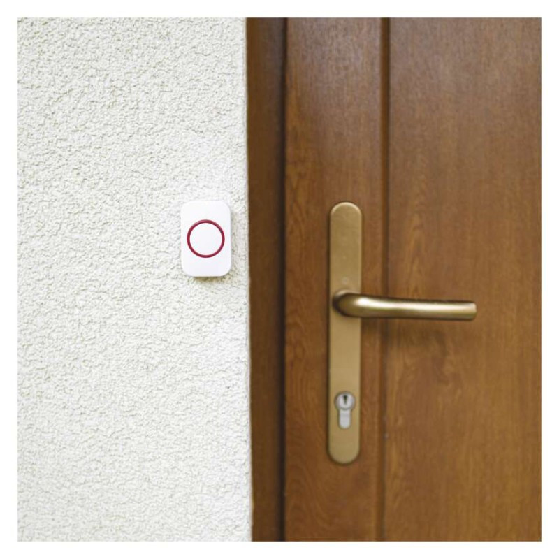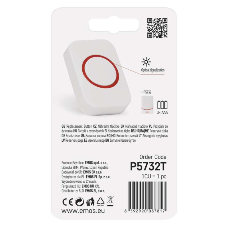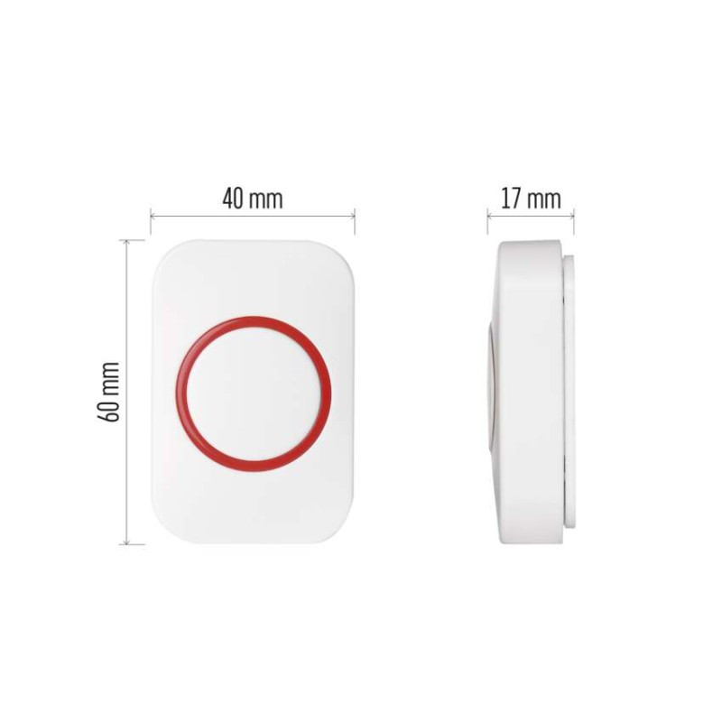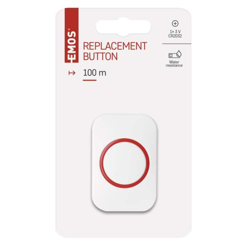a csengőtípushoz tervezett: P5732, P5733W, P5733S, P5733G|értékesítési csomagolás: 1 db, bliszter|hatótávolság szabad területen: akár 100 m|jelátviteli frekvencia: 433 MHz|jelátviteli módszer: vezeték nélküli|nyomógomb méretek: 17 × 40 × 60 mm|párosítási módszer: self-learning (automatikus párosítás)|táplálás: 1× 3 V CR2032 (tartozék)|védettség: IP44