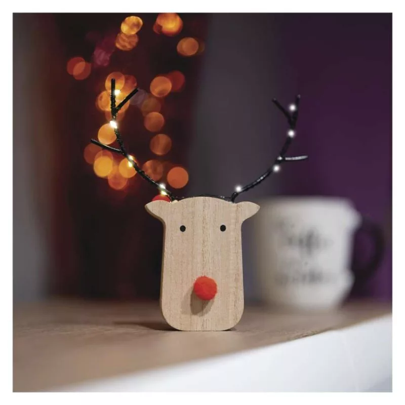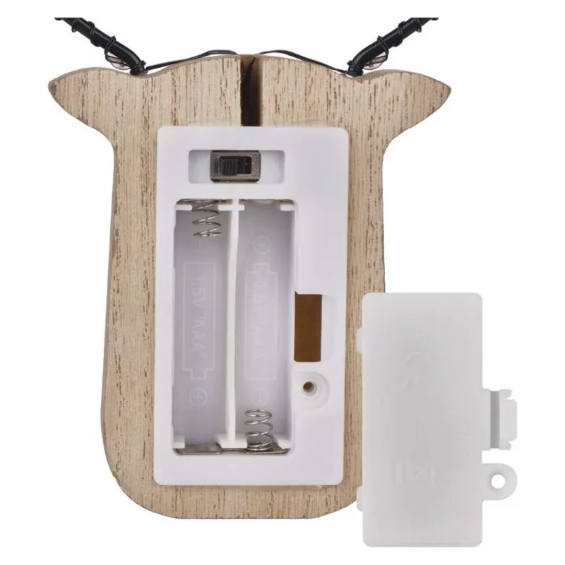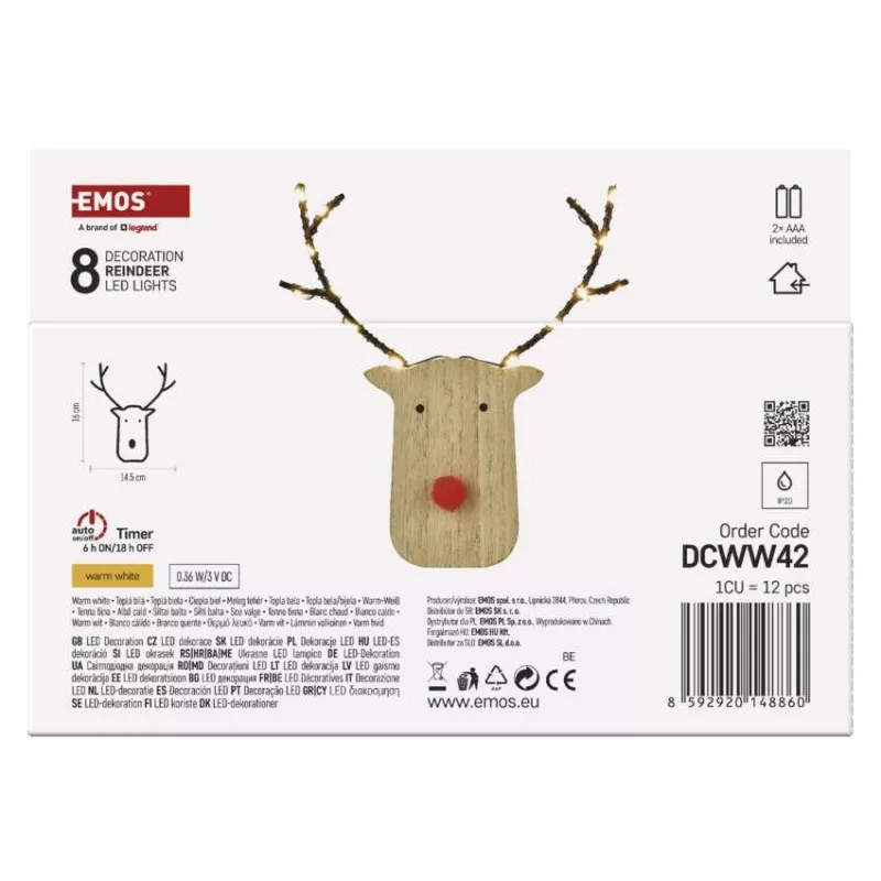 anyag: fa|bemeneti feszültség: –|élettartam: 10 000 óra|értékesítési csomagolás: 12 db, kínálódoboz|fényforrás: LED|fény színe: meleg fehér|fogyasztás: 0,36 W|garancia-időszak: 2 év|használat: beltéri|időzítő: igen|kábel színe: –|kimeneti feszültség: 3 V DC|LED-ek száma: 8|méretek: 14,5 × 2 ×16 cm|tápellátás típusa: elem 2× AAA (tartozék)|tápvezeték hossza: –|távvezérlő: nem|termék: rénszarvas|védettség: IP20