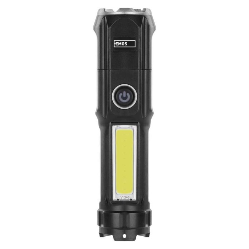 akkumulátor típusa: 1 200 mAh/3,7 V|anyag: műanyag|a töltés LED jelzése: igen|az akkumulátor állapotának LED-es jelzése: nincs megadva|elem a csomag része: igen|értékesítési csomagolás: 1 db, doboz|feltöltési idő: 2 óra|fényáram: LED 100 % – 100 lm, LED 50 % – 50 lm, COB LED 100 % – 150 lm|fényforrás: LED + COB LED|fókusz: igen|garancia-időszak: 2 év|jellemzők: nincs megadva|márka: EMOS|maximális fényárama: 150 lm|max. világítási távolság: 150 m|méretek: 132 × 35 × 32 mm|speciális funkciók: akkumulátorvédelem|súly: 80 g|szín: fekete|táplálás: Li-Ion 18650|tartozékok: tápkábel|tölthető: igen|töltőcsatlakozó típusa: micro USB|ütésállóság: igen|üzemidő részletezés: LED 100% - 4 h, LED 50% - 4,5 h, COB LED 100% - 2 h|üzemmódok: LED 100 %, LED 50 %, LED – villogó, COB LED 100 %|világítási idő: 2–4,5 h|világítási távolság: LED 100 % – 150 m, LED 50 % – 130 m, COB LED 100 % – 15 m|világítási üzemmódok száma: 4|vízálló: IP44