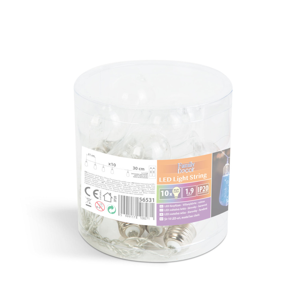 LED fényfüzér - Villanykörte - 10 LED - 1,9 méter - színes - 2 x AA