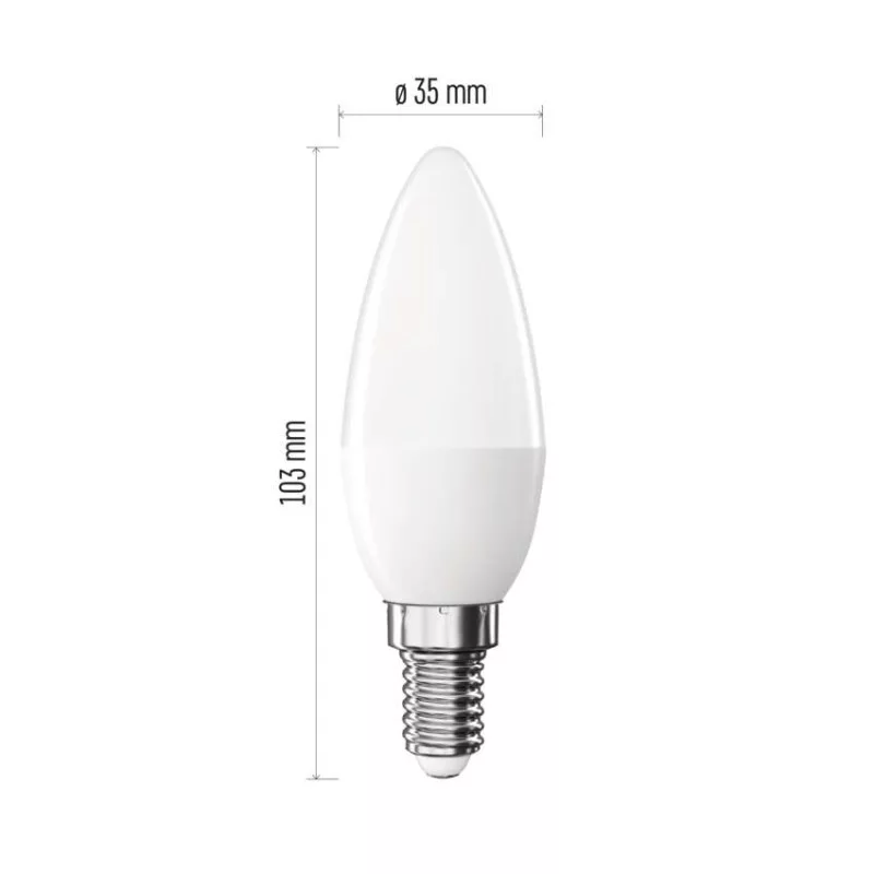 chipek száma: nincs megadva|chipek típusa: SMD|dimmelhető: nem|élettartam: 30 000 óra|energiaosztály: D|értékesítési csomagolás: 1 db, kis doboz|értesítések a mobilalkalmazáshoz: nem|fényáram: 350 lm|fényhasznosítás: 140 lm/W|fény színe: meleg fehér|feszültség: 230 V~/50 Hz|foglalat: E14|fogyasztás: 2,5 W|forma: gyertya|garancia-időszak: 3 év|hangalapú asszisztensek általi vezérlés: nem|helyettesítő: 32 W|jelátviteli frekvencia: –|kapcsolási ciklusok száma: 30 000|kompatibilitás: –|méretek: 35 × 35 × 103 mm|protokoll: –|sorozat: CLASSIC|sugárzási szög: 240°|színhőmérséklet: 2 700 K|színvisszaadási index (CRI): Ra >80|támogatott OS: –|technológia: LED|teljesítménytényező: 0.50