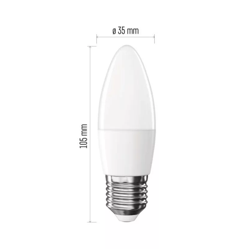 chipek száma: nincs megadva|chipek típusa: SMD|dimmelhető: nem|élettartam: 30 000 óra|energiaosztály: E|értékesítési csomagolás: 1 db, kis doboz|értesítések a mobilalkalmazáshoz: nem|fényáram: 470 lm|fényhasznosítás: 112 lm/W|fény színe: meleg fehér|feszültség: 230 V~/50 Hz|foglalat: E27|fogyasztás: 4,2 W|forma: gyertya|garancia-időszak: 3 év|hangalapú asszisztensek általi vezérlés: nem|helyettesítő: 40 W|jelátviteli frekvencia: –|kapcsolási ciklusok száma: 30 000|kompatibilitás: –|méretek: 35 × 35 × 105 mm|protokoll: –|sorozat: CLASSIC|sugárzási szög: 240°|színhőmérséklet: 2 700 K|színvisszaadási index (CRI): Ra >80|támogatott OS: –|technológia: LED|teljesítménytényező: 0.50