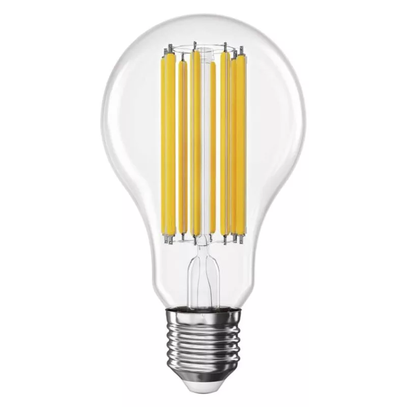 chipek száma: 8|chipek típusa: COB|dimmelhető: nem|élettartam: 25 000 óra|energiaosztály: D|értékesítési csomagolás: 1 db, kis doboz|értesítések a mobilalkalmazáshoz: nem|fényáram: 2 452 lm|fényhasznosítás: 136 lm/W|fény színe: meleg fehér|feszültség: 230 V~/50 Hz|foglalat: E27|fogyasztás: 18 W|forma: A70|garancia-időszak: 3 év|hangalapú asszisztensek általi vezérlés: nem|helyettesítő: 150 W|jelátviteli frekvencia: –|kapcsolási ciklusok száma: 25 000|kompatibilitás: –|méretek: 70 × 70 × 126 mm|protokoll: –|sorozat: FILAMENT|sugárzási szög: 360°|színhőmérséklet: 2 700 K|színvisszaadási index (CRI): Ra >80|támogatott OS: –|technológia: LED|teljesítménytényező: 0.50