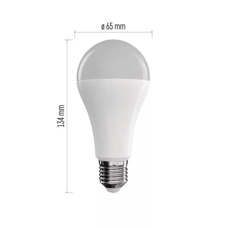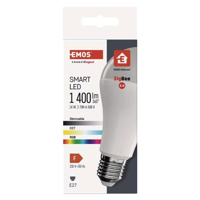 chipek száma: nincs megadva|chipek típusa: SMD|dimmelhető: igen|élettartam: 20 000 óra|energiaosztály: F|értékesítési csomagolás: 1 db, kis doboz|értesítések a mobilalkalmazáshoz: igen|fényáram: 1 400 lm|fényhasznosítás: 100 lm/W|fény színe: RGB|feszültség: 230 V~/50 Hz|foglalat: E27|fogyasztás: 14 W|forma: A65|garancia-időszak: 2 év|hangalapú asszisztensek általi vezérlés: igen|helyettesítő: 94 W|jelátviteli frekvencia: ZigBee 2,4 GHz|kapcsolási ciklusok száma: 15 000|kompatibilitás: EMOS GoSmart, Tuya, Lidl, Smartlife|méretek: 65 × 65 × 134 mm|protokoll: Zigbee 3.0|sorozat: GoSmart|sugárzási szög: 200°|színhőmérséklet: 2 700–6 500 K|színvisszaadási index (CRI): Ra >80|támogatott OS: Android, iOS|technológia: LED|teljesítménytényező: 0,65