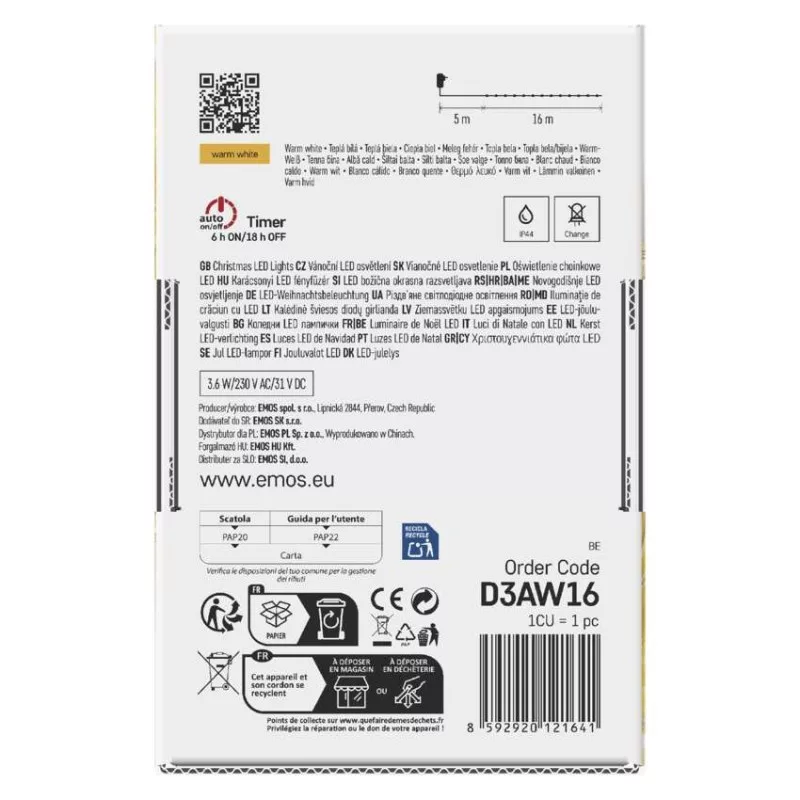 a fa magasságához: nincs megadva|anyag: PVC|bemeneti feszültség: 230 V AC|csatlakoztatási lehetőség: nem|élettartam: 10 000 óra|értékesítési csomagolás: 1 db, doboz|fény színe: meleg fehér|fogyasztás: 3,6 W|forma: drop|funkció: világít|garancia-időszak: 2 év|használat: kültéri és beltéri|időzítő: igen|kábel színe: átlátszó|kimeneti feszültség: 31 V DC|LED-ek közötti távolság: nincs megadva|LED-ek száma: 160|LED mérete: nincs megadva|méretek: 16 m|tápellátás típusa: AC (hálózati) adapter|tápvezeték hossza: 5 m|távvezérlő: nem|termék: lánc|védettség: IP44
