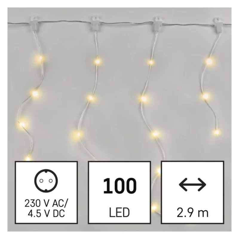 a fa magasságához: nincs megadva|alkalmazási nyelvek: –|anyag: PVC|bemeneti feszültség: 230 V AC|csatlakoztatási lehetőség: nem|egyéb funkciók: –|élettartam: 10 000 óra|értékesítési csomagolás: 1 db, doboz|értesítések a mobilalkalmazáshoz: #|fény színe: meleg fehér|fogyasztás: 2,1 W|forma: drop|funkció: 8 üzemmód (multifunkcionális)|garancia-időszak: 2 év|hangalapú asszisztensek általi vezérlés: #|használat: kültéri és beltéri|időzítő: igen|jelátviteli frekvencia: –|kábel színe: átlátszó|kimeneti feszültség: 4,5 V DC|kompatibilitás: –|LED-ek közötti távolság: nincs megadva|LED-ek száma: 100|LED mérete: nincs megadva|méretek: 2,9 × 0,7 m|protokoll: –|támogatott OS: –|tápellátás típusa: AC (hálózati) adapter|tápvezeték hossza: 5 m|távvezérlő: nem|termék: jégcsap|védettség: IP44