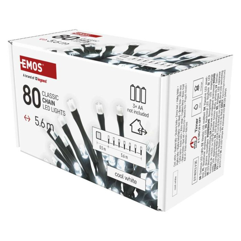a fa magasságához: nincs megadva|anyag: PVC|bemeneti feszültség: nincs megadva|csatlakoztatási lehetőség: nem|élettartam: 10 000 óra|értékesítési csomagolás: 1 db, doboz|fény színe: hideg fehér|fogyasztás: 0,9 W|forma: nincs megadva|funkció: világít|garancia-időszak: 2 év|használat: kültéri és beltéri|időzítő: igen|kábel színe: fekete|kimeneti feszültség: 4,5 V DC|LED-ek közötti távolság: nincs megadva|LED-ek száma: 80|LED mérete: nincs megadva|méretek: 5,6 m|tápellátás típusa: elem 3× AA (nem a csomag része)|tápvezeték hossza: 0,5 m|távvezérlő: nem|termék: lánc|védettség: IP44