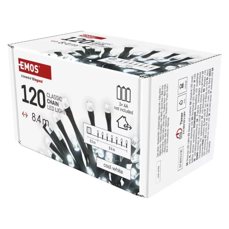 a fa magasságához: nincs megadva|alkalmazási nyelvek: #|anyag: PVC|bemeneti feszültség: nincs megadva|csatlakoztatási lehetőség: nem|egyéb funkciók: #|élettartam: 10 000 óra|értékesítési csomagolás: 1 db, doboz|értesítések a mobilalkalmazáshoz: #|fény színe: hideg fehér|fogyasztás: 0,9 W|forma: nincs megadva|funkció: világít|garancia-időszak: 2 év|hangalapú asszisztensek általi vezérlés: #|használat: kültéri és beltéri|időzítő: igen|jelátviteli frekvencia: #|kábel színe: fekete|kimeneti feszültség: 4,5 V DC|kompatibilitás: #|LED-ek közötti távolság: nincs megadva|LED-ek száma: 120|LED mérete: nincs megadva|méretek: 8,4 m|protokoll: #|támogatott OS: #|tápellátás típusa: elem 3× AA (nem a csomag része)|tápvezeték hossza: 0,5 m|távvezérlő: nem|termék: lánc|védettség: IP44