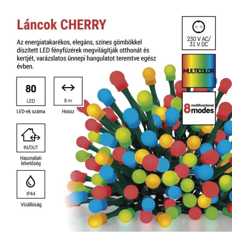 LED karácsonyi fényfüzér, cseresznye – golyók, 8 m,kültéri és beltéri,többszínű,progr,időz