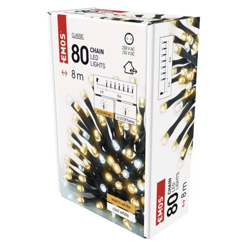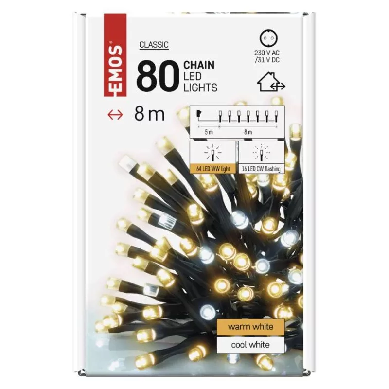 a fa magasságához: 140 cm|anyag: PVC|bemeneti feszültség: 230 V AC|csatlakoztatási lehetőség: nem|élettartam: 10 000 óra|értékesítési csomagolás: 1 db, doboz|fény színe: hideg/meleg fehér|fogyasztás: 3,6 W|forma: klasszikus|funkció: világít/villog|garancia-időszak: 2 év|használat: kültéri és beltéri|időzítő: igen|kábel színe: fekete|kimeneti feszültség: 31 V DC|LED-ek közötti távolság: 10 cm|LED-ek száma: 80|LED mérete: 5 mm|méretek: 8 m|tápellátás típusa: AC (hálózati) adapter|tápvezeték hossza: 5 m|távvezérlő: nem|termék: lánc|védettség: IP44