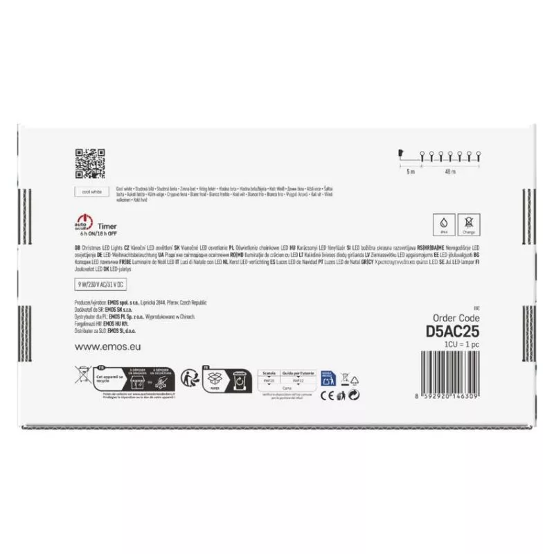 a fa magasságához: 300 cm|alkalmazási nyelvek: –|anyag: PVC|bemeneti feszültség: 230 V AC|csatlakoztatási lehetőség: nem|egyéb funkciók: –|élettartam: 10 000 óra|értékesítési csomagolás: 1 db, doboz|értesítések a mobilalkalmazáshoz: nem|fény színe: hideg fehér|fogyasztás: 9 W|forma: kis golyó|funkció: 8 üzemmód (multifunkcionális)|garancia-időszak: 2 év|hangalapú asszisztensek általi vezérlés: nem|használat: kültéri és beltéri|időzítő: igen|jelátviteli frekvencia: –|kábel színe: zöld|kimeneti feszültség: 31 V DC|kompatibilitás: –|LED-ek közötti távolság: 10 cm|LED-ek száma: 480|LED mérete: 10 mm|méretek: 48 m|protokoll: –|támogatott OS: –|tápellátás típusa: AC (hálózati) adapter|tápvezeték hossza: 5 m|távvezérlő: nem|termék: lánc|védettség: IP44