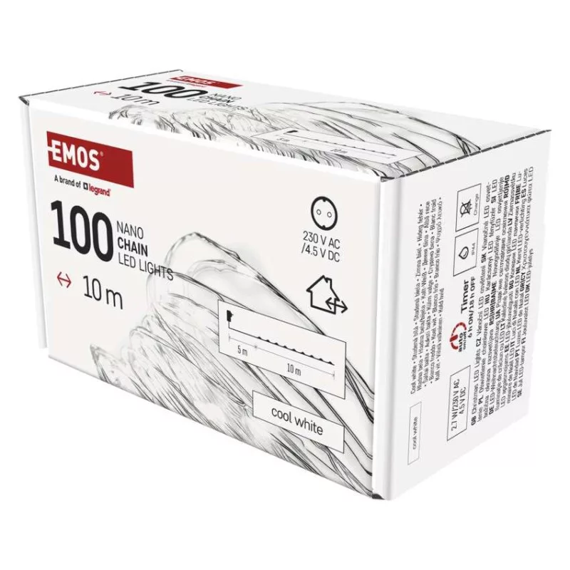 a fa magasságához: 160 cm|anyag: fém|bemeneti feszültség: 230 V AC|csatlakoztatási lehetőség: nem|élettartam: 10 000 óra|értékesítési csomagolás: 1 db, doboz|fény színe: hideg fehér|fogyasztás: 2,7 W|forma: nano|funkció: világít|garancia-időszak: 2 év|használat: kültéri és beltéri|időzítő: igen|kábel színe: ezüst|kimeneti feszültség: 4,5 V DC|LED-ek közötti távolság: 10 cm|LED-ek száma: 100|LED mérete: 3 mm (nano)|méretek: 10 m|tápellátás típusa: AC (hálózati) adapter|tápvezeték hossza: 5 m|távvezérlő: nem|termék: nano lánc|védettség: IP44