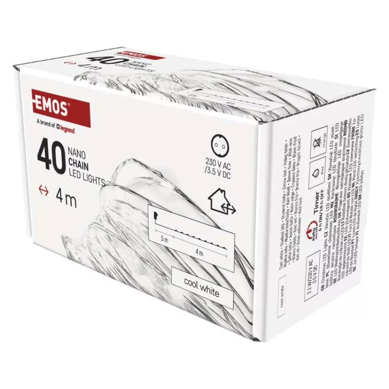 a fa magasságához: 100 cm|anyag: fém|bemeneti feszültség: 230 V AC|csatlakoztatási lehetőség: nem|élettartam: 10 000 óra|értékesítési csomagolás: 1 db, doboz|fény színe: hideg fehér|fogyasztás: 2,1 W|forma: nano|funkció: világít|garancia-időszak: 2 év|használat: kültéri és beltéri|időzítő: igen|kábel színe: ezüst|kimeneti feszültség: 3,5 V DC|LED-ek közötti távolság: 10 cm|LED-ek száma: 40|LED mérete: 3 mm (nano)|méretek: 4 m|tápellátás típusa: AC (hálózati) adapter|tápvezeték hossza: 5 m|távvezérlő: nem|termék: nano lánc|védettség: IP44