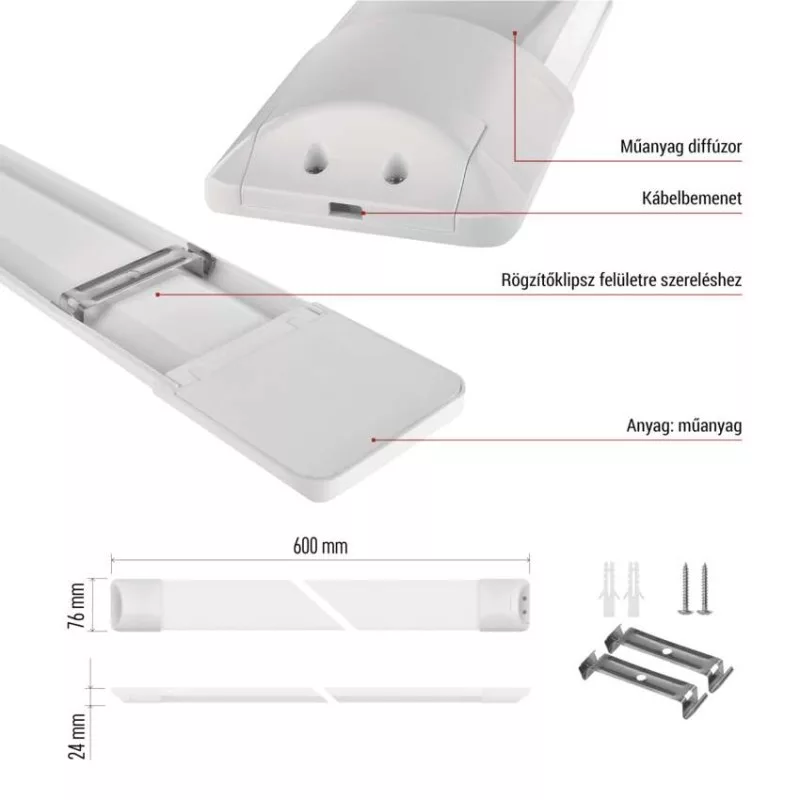 a diffúzor anyaga: műanyag (PC)|a diffúzor anyaga: tejfehér|akkumulátor garancia: nincs megadva|anyag: műanyag (PC)|áramerősség: 150 mA|áthidalási idő: nincs megadva|élettartam: 25 000 óra|értékesítési csomagolás: 1 db, doboz|fényáram: 2 200 lm|fényáram vészhelyzeti üzemmódban: nincs megadva|fényforrás: LED|fény színe: természetes fehér|feszültség: 220–240 V~|fogyasztás: 20 W|frekvencia: 50/60 Hz|futóegység: nincs megadva|garancia-időszak: 2 év|helyettesítő: nincs megadva|kapocs anyaga: nincs kapocs|keret színe: fehér|lámpatest: műanyag (PC)|mechanikai behatás elleni védelem: IK06|méretek: 600 × 75,5 × 24,5 mm|rögzítés típusa: felcsatolva|sugárzási szög: 120°|színhőmérséklet: 4 000 K|színvisszaadási index (CRI): Ra >80|tompító funkció: nem|üzemi hőmérséklet tartomány: -20 °C és +40 °C|védelmi osztály: II|védettség: IP20|vezérlés típusa: nincs megadva