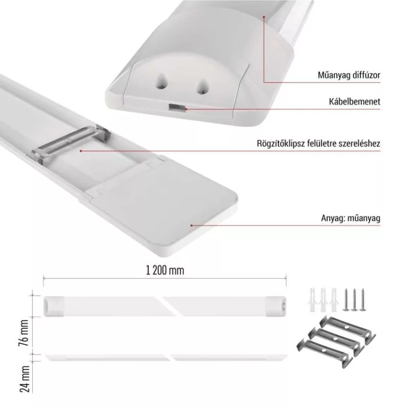 a diffúzor anyaga: műanyag (PC)|a diffúzor anyaga: tejfehér|akkumulátor garancia: nincs megadva|anyag: műanyag (PC)|áramerősség: 180 mA|áthidalási idő: nincs megadva|élettartam: 25 000 óra|értékesítési csomagolás: 1 db, doboz|fényáram: 4 400 lm|fényáram vészhelyzeti üzemmódban: nincs megadva|fényforrás: LED|fény színe: természetes fehér|feszültség: 220–240 V~|fogyasztás: 40 W|frekvencia: 50/60 Hz|futóegység: nincs megadva|garancia-időszak: 2 év|helyettesítő: nincs megadva|kapocs anyaga: nincs kapocs|keret színe: fehér|lámpatest: műanyag (PC)|mechanikai behatás elleni védelem: IK06|méretek: 1 200 × 75,5 × 24,5 mm|rögzítés típusa: felcsatolva|sugárzási szög: 120°|színhőmérséklet: 4 000 K|színvisszaadási index (CRI): Ra >80|tompító funkció: nem|üzemi hőmérséklet tartomány: -20 °C és +40 °C|védelmi osztály: II|védettség: IP20|vezérlés típusa: nincs megadva