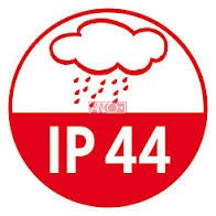 - IP44: kültéri; apró méretű szilárd tárgyak ellen védett (>1 mm); fröccsenő víz ellen védett minden irányból