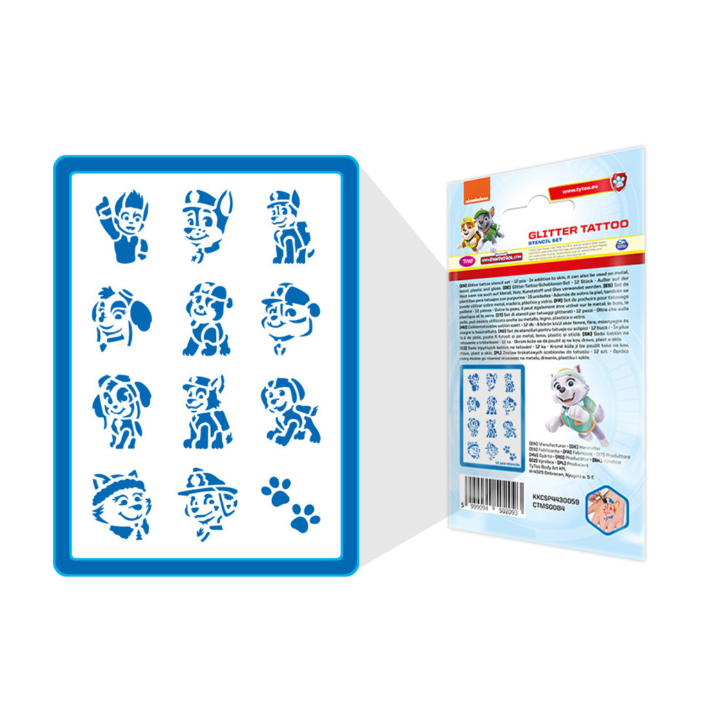 A csomagban található sablonok segítségével Mancs őrjáratos csillámtetoválás mintákat készíthet, melyeket egyéb testfestéshez is felhasználhat. Szinte minden gyermek rajong a Mancs őrjáratért amelyben a szereplők minden egyes epizódban hősiesen mentik meg a bajbajutottakat. A főszereplő kisfiú Ryder és ügyes kutyái a Kaland-öbölben néznek szembe a nem mindennapi kihívásokkal, amelyekből mindig győztesen keverednek ki.