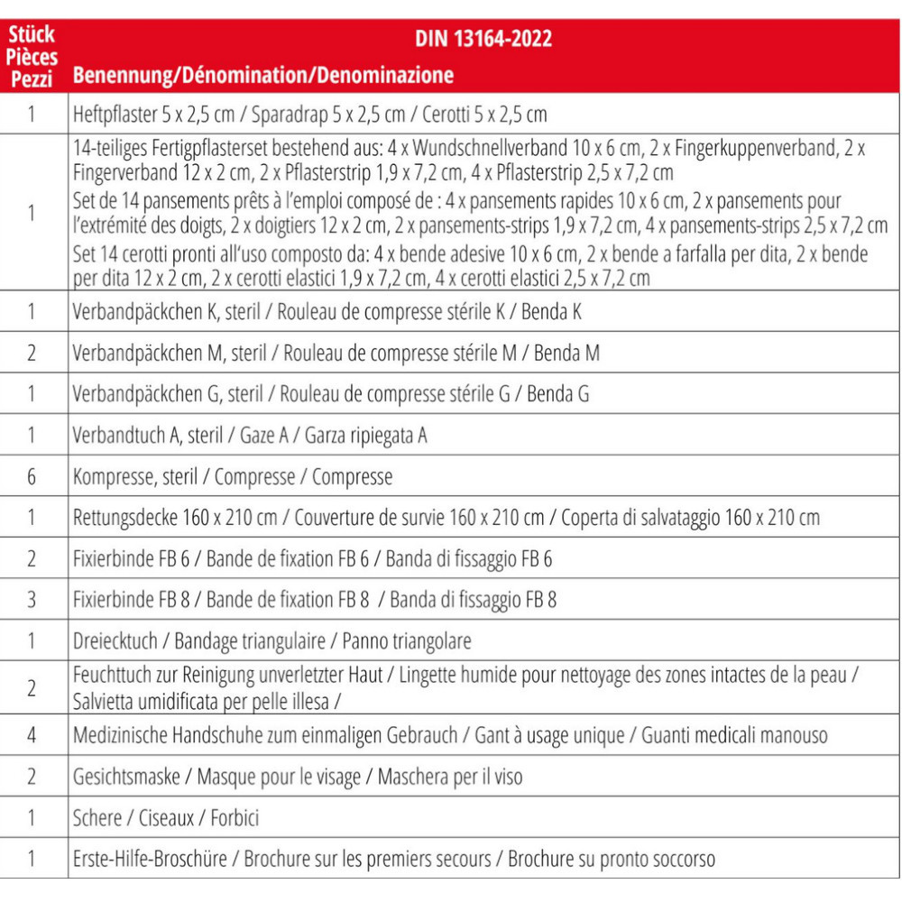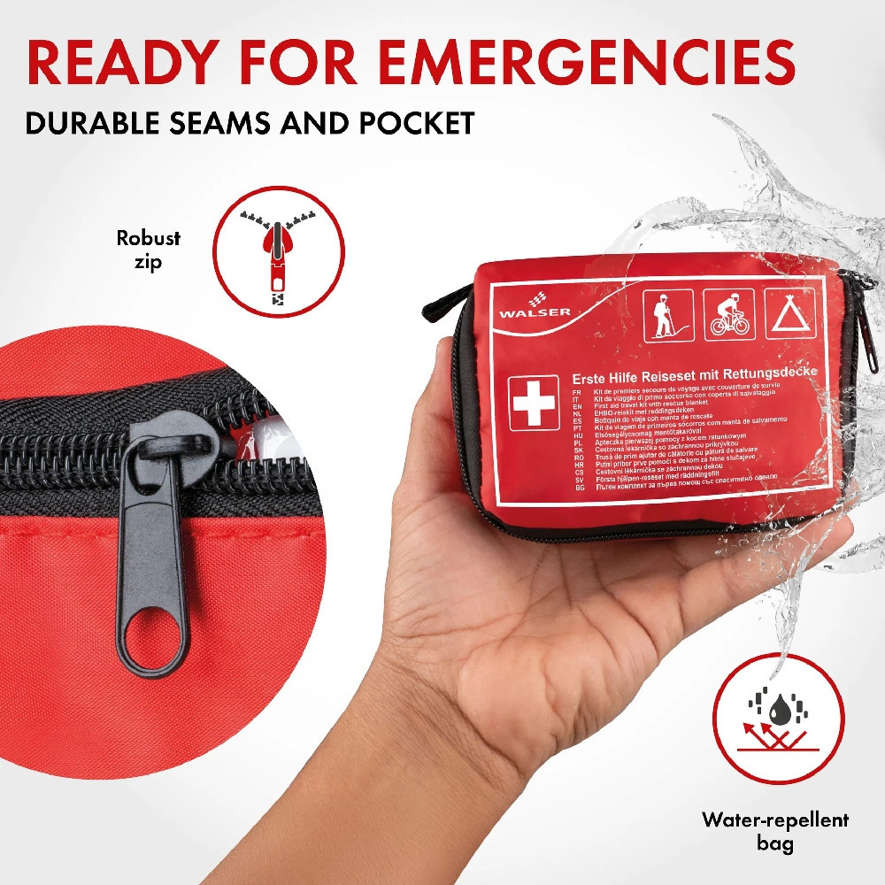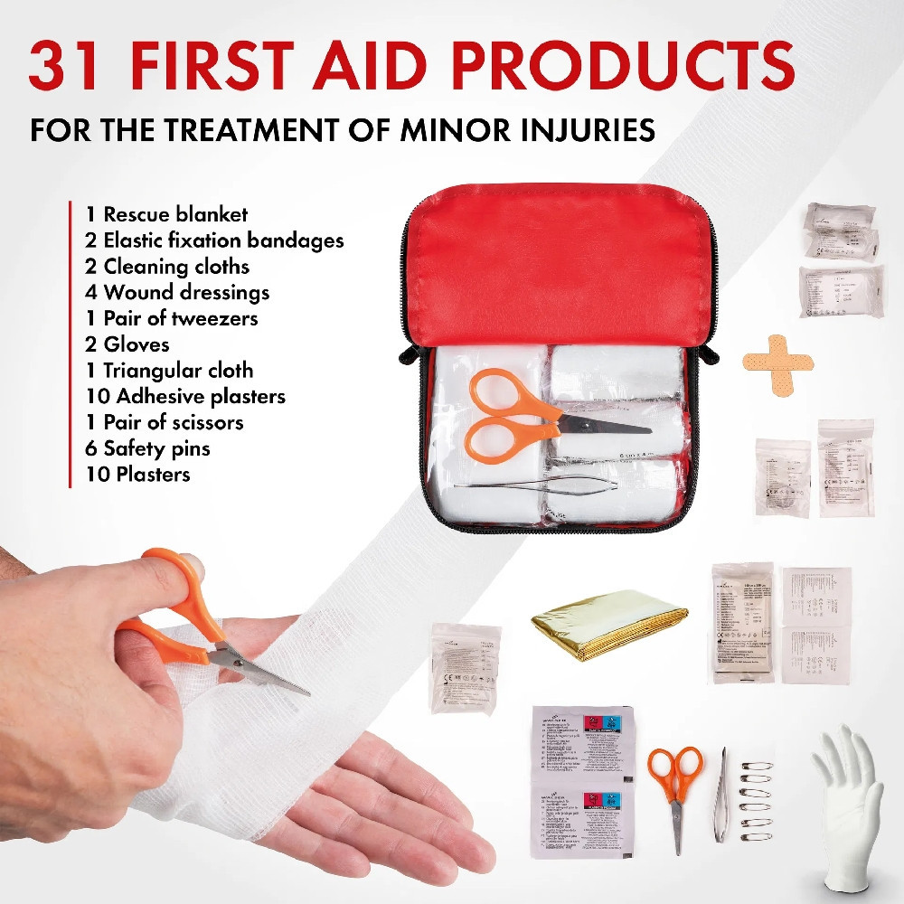 A készlet 31 gondosan válogatott elsősegélynyújtó terméket tartalmaz. A mentőtakaróktól, ragtapaszoktól és sebkötözőktől a háromszög alakú kötszerig mindent megtalál, amire vészhelyzet esetén szüksége lehet. Eldobható kesztyű és olló is található benne. A vízálló táskának köszönhetően a tartalom minden időjárásban védve marad, és mindig kéznél van.