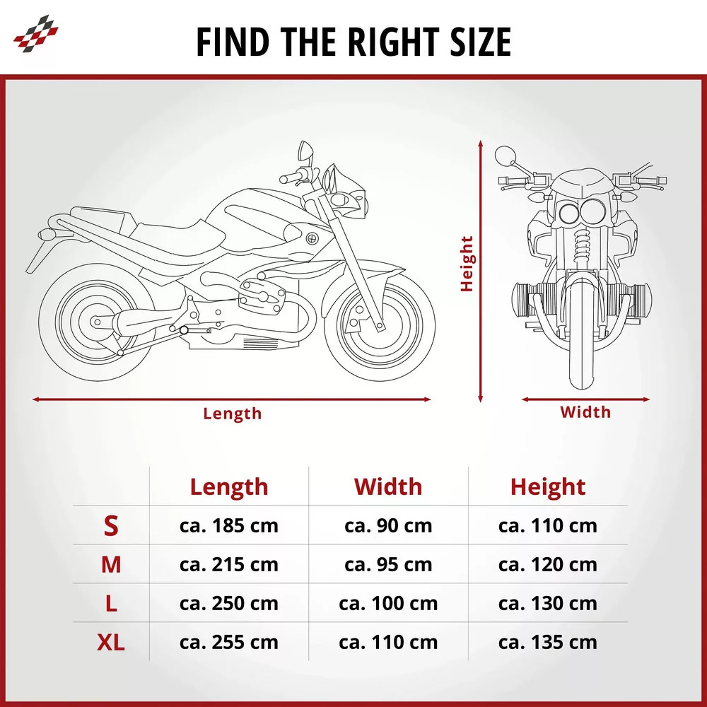 Miután leparkolta a motorkerékpárt és a motor lehűlt, húzza át a ponyvát az egész gépen. Ezután zárja be az alján található pattintható zárat. Ezenkívül erős fűzőlyukak vannak bevarrva, amelyek a lopásgátló eszközök, például a felnizár rögzítésére szolgálnak. Mostantól nyáron és télen is a szabadban hagyhatja motorját, és többé nem kell aggódnia.