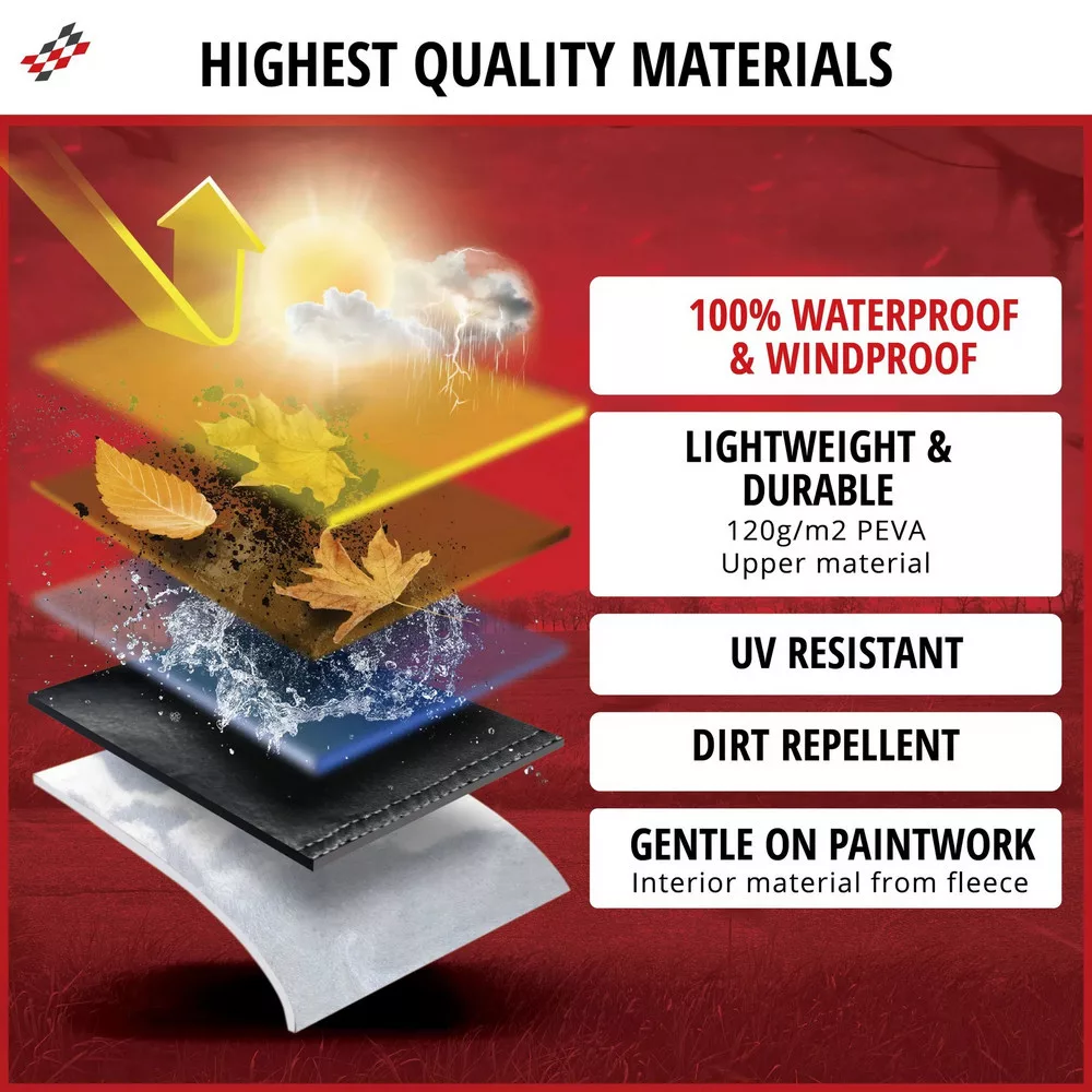 A termék kiváló minőségű PEVA anyagból készült, amely egyben időjárásálló, vízálló és még télálló is. A fényezésbarát belső rész védi motorkerékpárja felületét is. Így nyugodtan kint hagyhatja kedvenc gépét, tökéletesen védett hó, eső, szennyeződés és nap ellen.