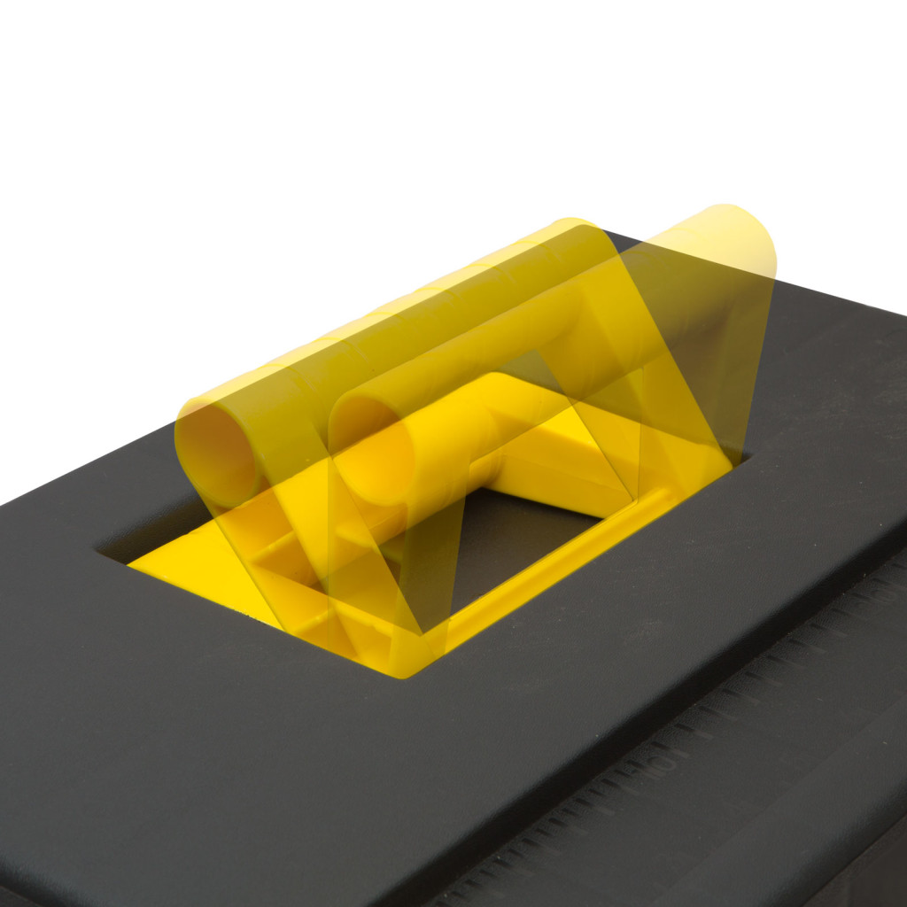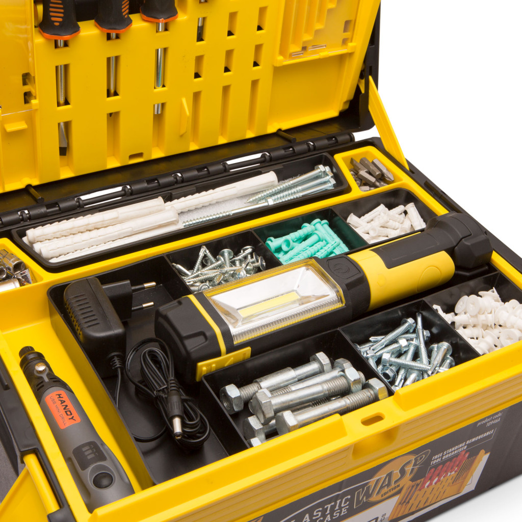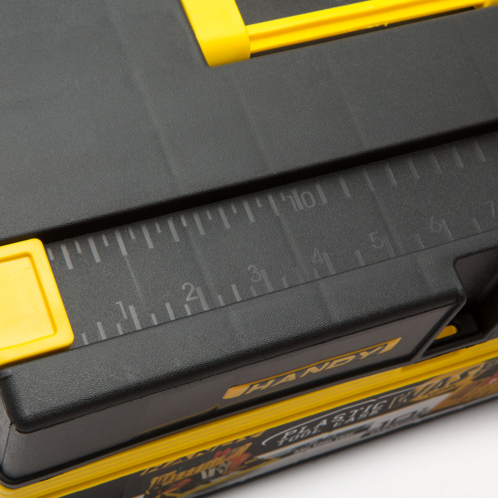 Kis méretének köszönhetően könnyen hordozható, mégis rengeteg tárolórekesszel rendelkezik. Fedlapján beépített vonalzó található, amely vészhelyzetekben is pontos mérést tesz lehetővé. Ezt a műanyag ládát kinyitva, a tetejében beépített tárolót találunk, amely kivehető tartóállvány önmagában is használható. Ideális fúrószárakat, csavarhúzók tárolására. Könnyen használható, egy mozdulattal kivehető a mobilitás megőrzése érdekében, így nem szükséges kipakolnia az egész ládát hogy a megfelelő eszközt megtalálja. A táska felső részében egy kihúzható fiók van, amely 6 kisebb és 1 nagyobb tárolóval szerelt tálca található. A fiókból kivehető műanyag tálca kiválóan alkalmassá teszi csavarok, tiplik tárolására.