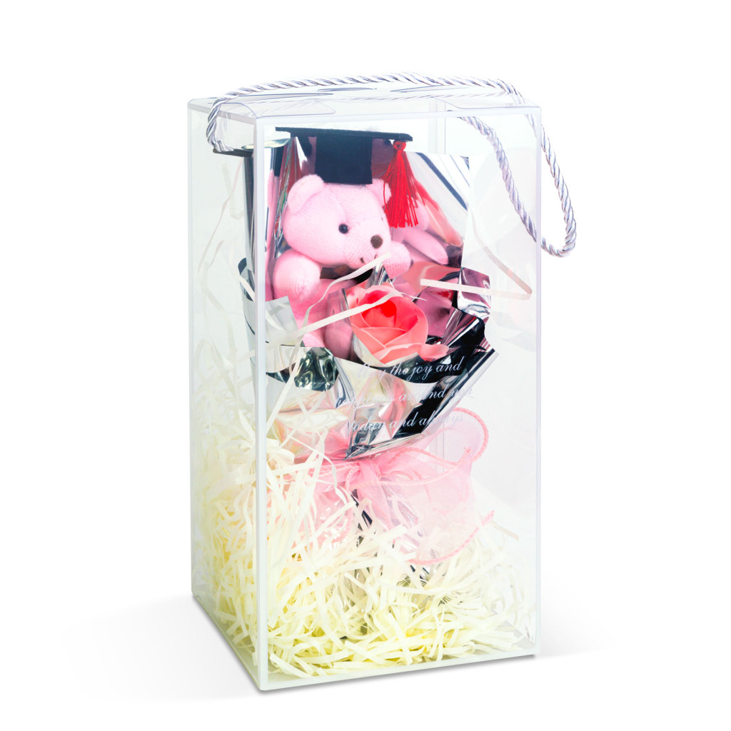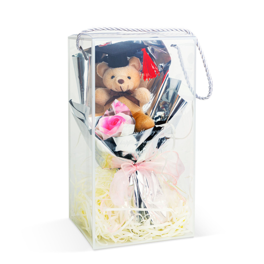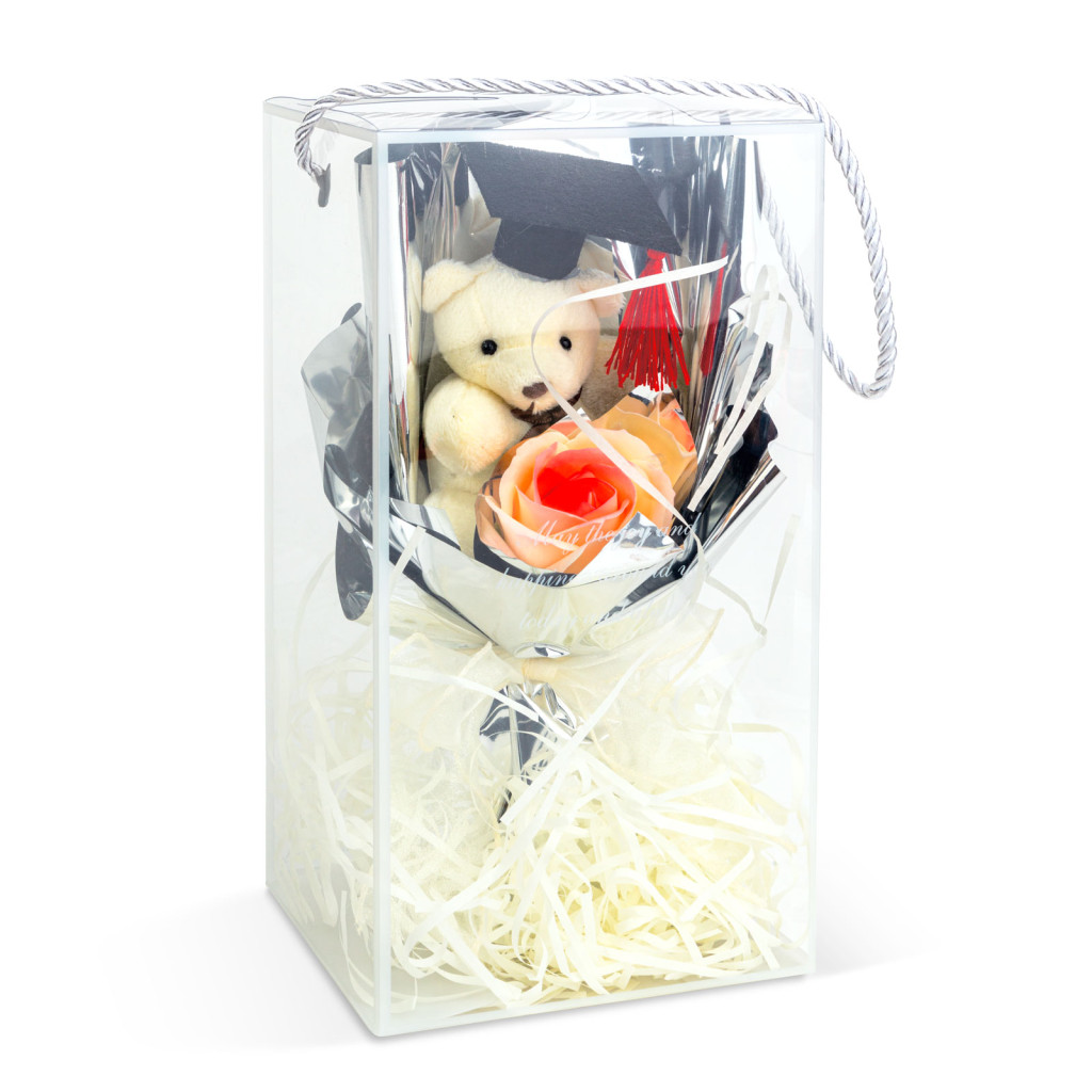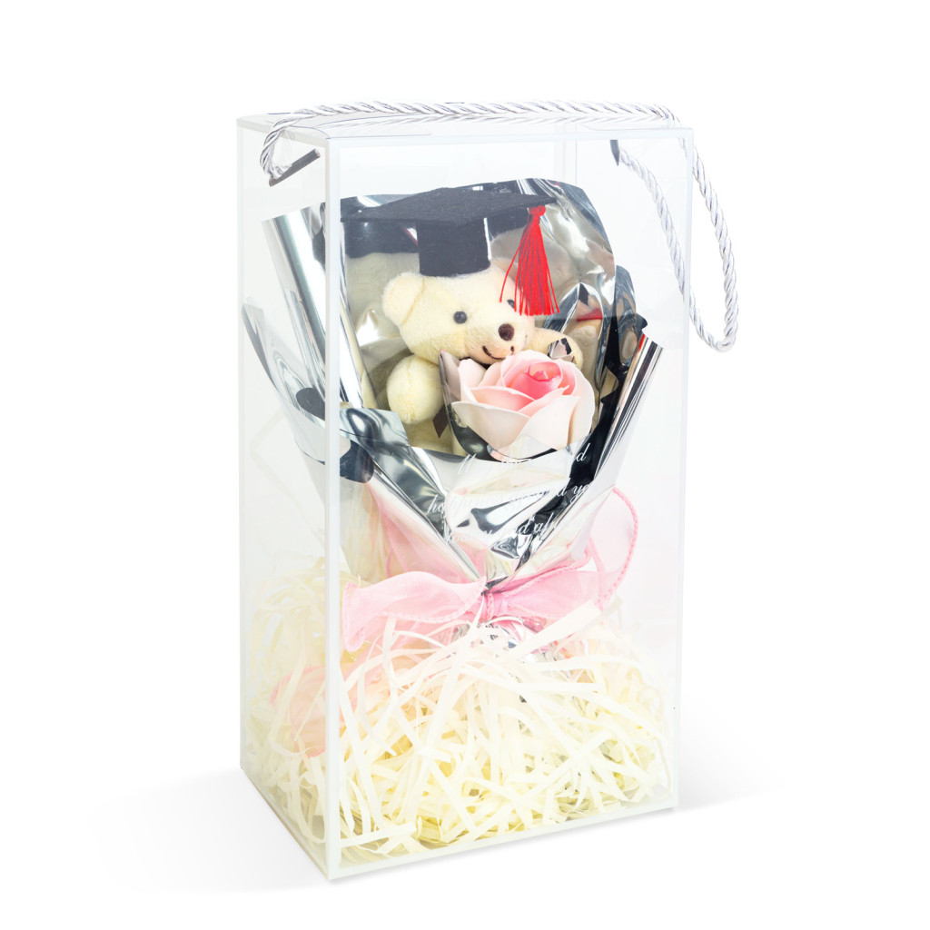 Lepje meg szerettét egy különleges ajándékkal! Ezzel a díszdobozos macival felejthetetlen lesz az ünnep, legyen szó ballagásról, évfordulóról, eljegyzésről, karácsonyról vagy akár születésnapról, névnapról. A csomag tartalmaz egy aranyos plüss mackót és egy szál virágot. A mackó és a virág, fényes, elegáns papírba van csomagolva. A kompozíció egy plexi dobozban kerül szállításra, melynek exkluzivitását mutatja, hogy az alsó részét fehér papírszálakkal bélelték ki. Ez a bájos ajándék tökéletes lehet romantikus, évfordulós alkalmakra, mint például Valentin-nap, születésnapok, vagy egyéb ünnepek alkalmával. A meglepetés garantált!