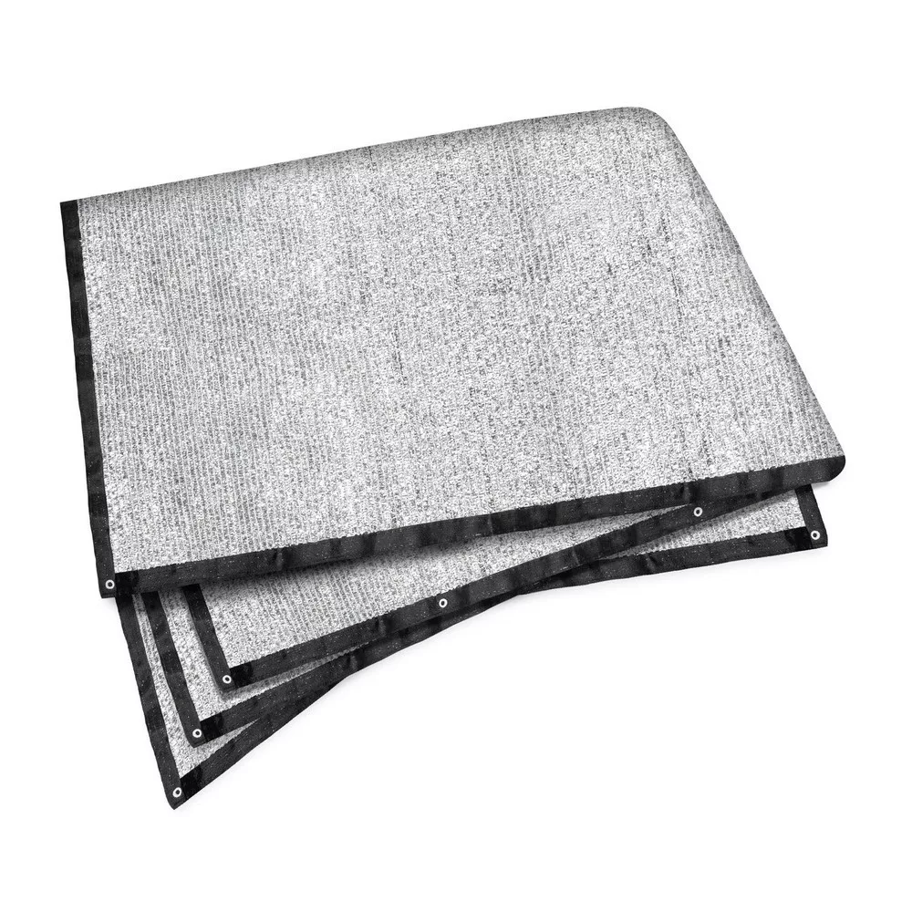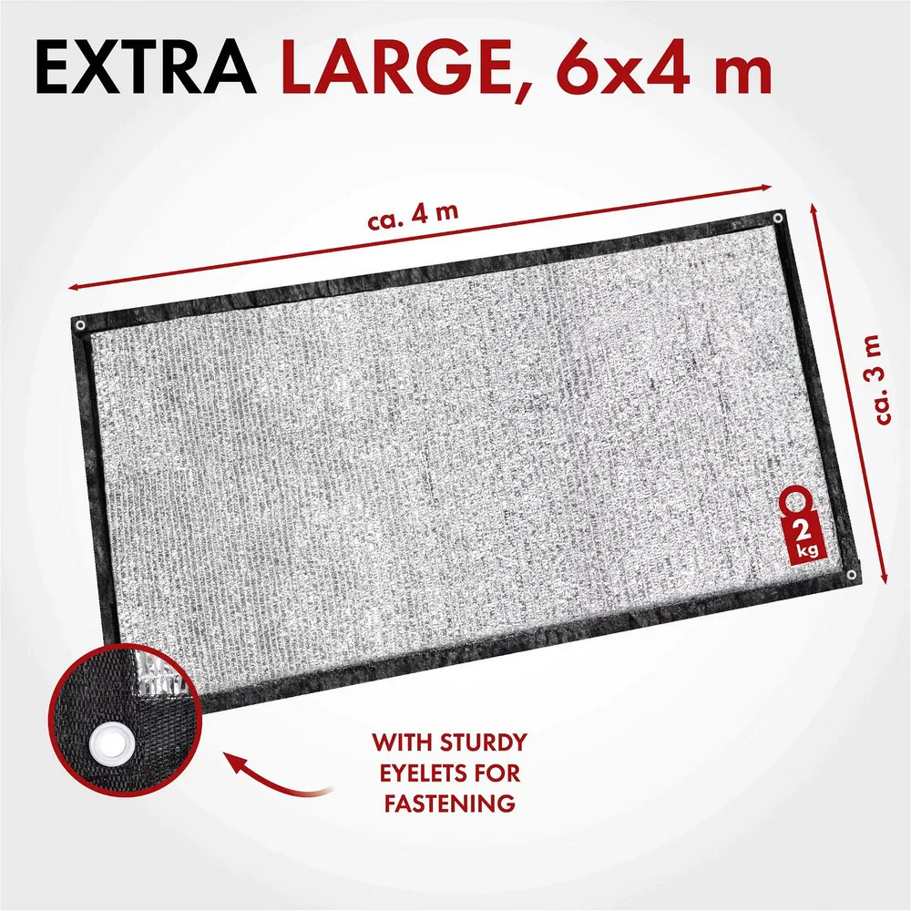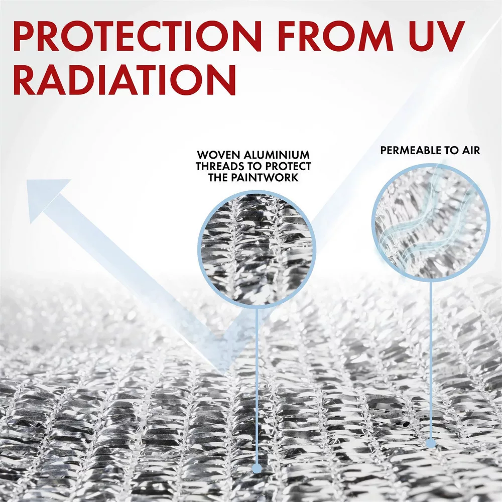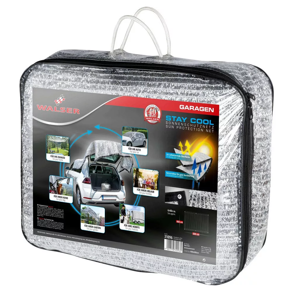 A napellenző háló szőtt alumínium fonalból készül, amely nagyon jól visszaveri az UV-sugarakat. Ennek eredményeként a hő visszaverődik, jelentősen csökkenti az autó felmelegedését. Ráadásul a szövött szerkezet nagyon légáteresztő, így jó szellőzést tesz lehetővé az árnyékos burkolat alatt. Erős szegéllyel rendelkezik, széles szalaggal és praktikus fűzőlyukakkal a szélén, hogy megkönnyítse a rögzítést. Ezzel szinte mindenhol használhatja a napellenző hálót: Fektesse le a takarót az autóra, amikor nincs árnyékos parkolóhely, feszítse rá a csomagtérfedélre, hogy megvédje kutyáját a közvetlen napsugárzástól, vagy akassza fel a StayCool hálót a fákra.