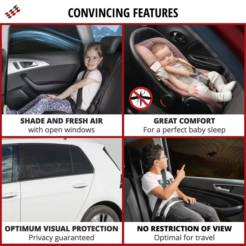 Rettentő forró napokon autója gyakran ki van téve a nap erős sugárzásának és ennek következtében a belső tér gyors felmelegedésének. Annak érdekében, hogy gyermekei és a hátsó ülésen ülő utasok védve legyenek az erős napsugaraktól, kifejlesztettük ezeket a praktikus ablakhálókat. Ez a megoldás kiváló minőségű hálószövetből, kifejezetten az autók hátsó oldalablakaihoz készült. Az ablakháló nyugtató árnyékot ad és védi a belső teret az erős napfénytől. Ezenkívül távol tartják a bosszantó rovarokat, így élvezheti a pihentető utazást. Amikor a napsugarak elkezdenek behatolni az autó belsejébe és túlmelegszik, egyszerűen felhúzhatja a hátsó ajtókeretre. Az erős elasztikus szalag szilárd tartást biztosít. Felhelyezés után is könnyedén kinyithatja és becsukhatja az ablakot, ami lehetővé teszi a jármű kényelmes szellőzését.