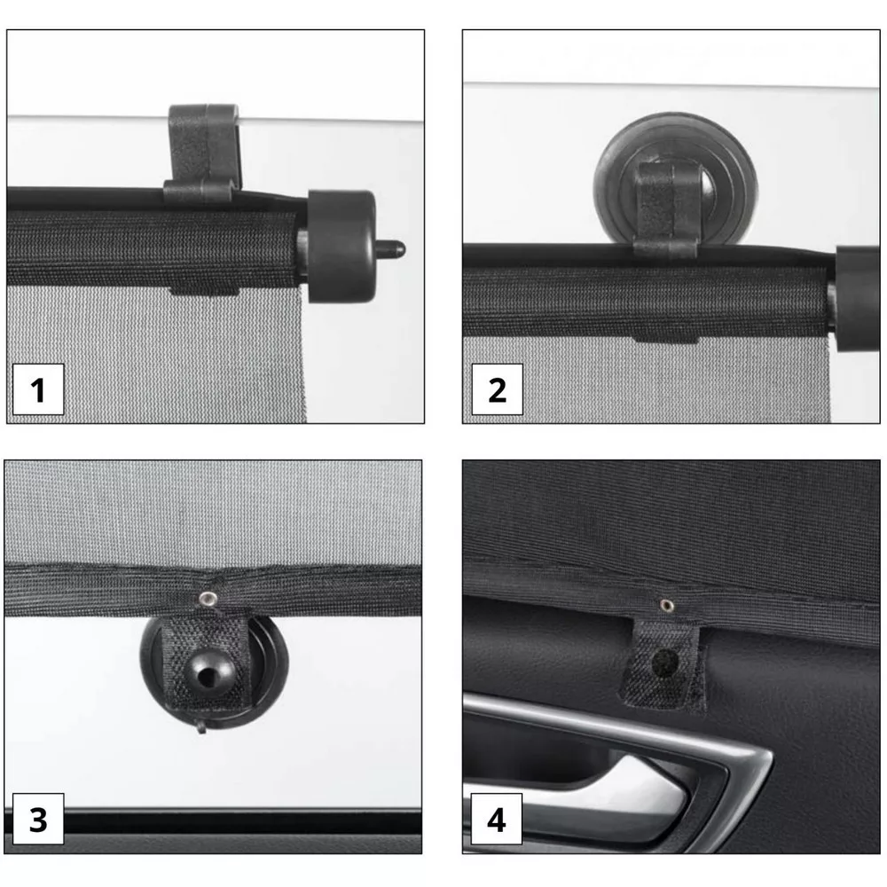 Az Univerzális méretű napellenzők minden autóhoz alkalmasak, 2 különböző módon rögzíthetők az oldalablakokra. Egyrészt a rolóban szilárdan integrált műanyag kampók találhatók, amelyek könnyen felakaszthatók közvetlenül az ablak felső peremére. Alternatív megoldásként a napvédőt közvetlenül az ablaküvegre is rögzíthetjük a mellékelt tapadókorongok segítségével. Ez a változat lehetővé teszi a redőny kívánt magasságának és helyzetének kiválasztását és beállítását. Így egyenként is elhelyezhetők, hogy tökéletesen megvédjék utasait a napsütéstől. Általánosságban elmondható, hogy a napellenzők egy egyszerű feszítőszalag-rendszer segítségével könnyen le- és feltekerhetők. A napellenzőhöz egy tépőzár van rögzítve, amellyel a redőnyt lehúzás után azonnal rögzítheti.