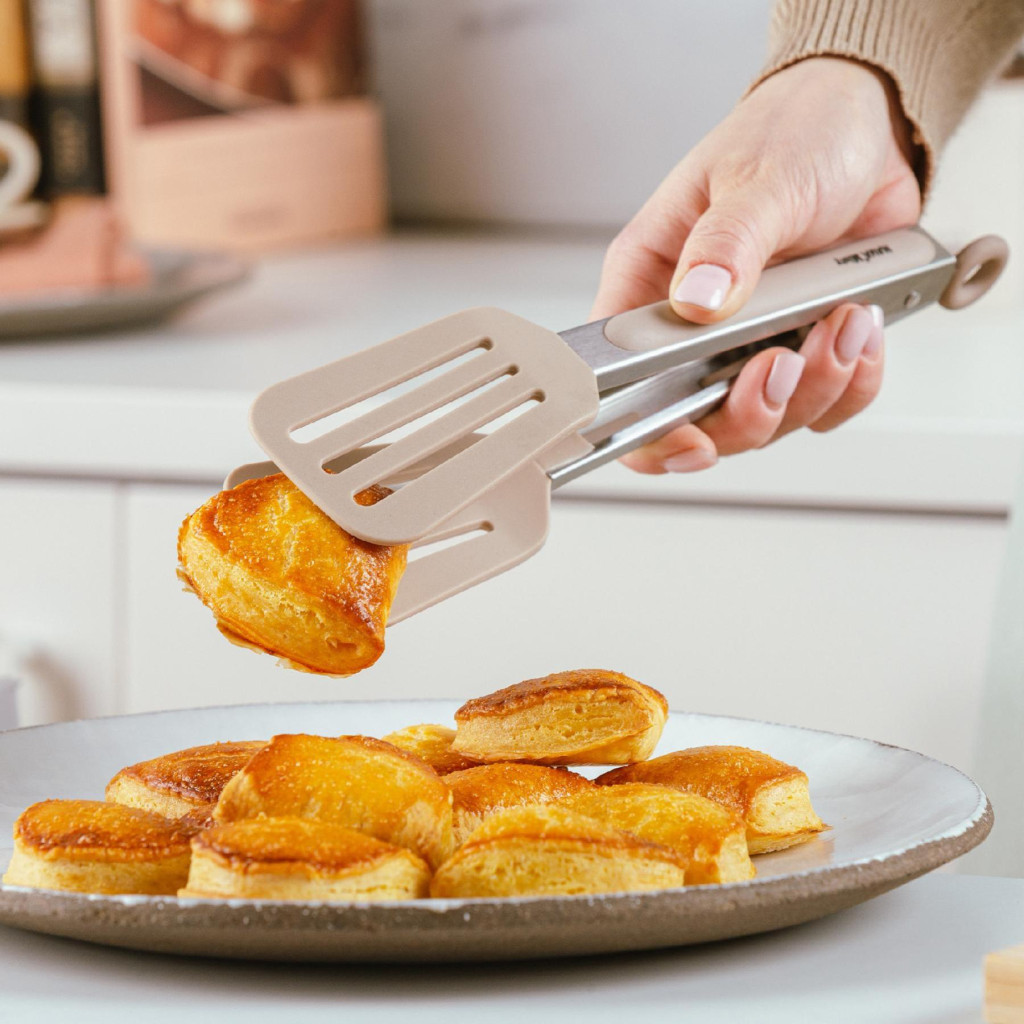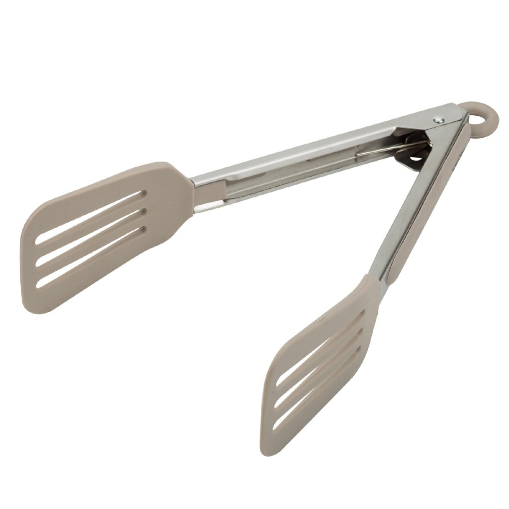 Ez a kiváló minőségű, élelmiszerrel érintkezésre alkalmas szilikonfejjel rendelkező ételfogó (hossza 26 cm) ellenáll a magas hőmérsékletnek, akár 200°C-ig. Ergonomikus, csúszásmentes markolata kényelmes és biztonságos fogást biztosít használat közben. A markolat végén található biztonsági zár az ételfogót zárt állapotban tartja, így helytakarékos tárolást tesz lehetővé. A praktikus akasztólyuknak köszönhetően könnyedén felakasztható, hogy mindig kéznél legyen, amikor szükség van rá.