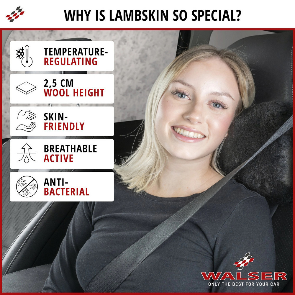A támaszték tökéletes kiegészítője minden autónak, és nyugodt üléshelyzetet biztosít. Hangulatos báránybőrével csábít, és minden utazás során optimális támogatást nyújt a nyaknak. A nyaktámasz valódi, gyönyörű báránybőrből készült, a gyapjú magassága 25 mm. A betét hátoldalát textil borítja. A báránybőr hőmérsékletszabályozó tulajdonságokkal rendelkezik, és sok nedvességet képes felszívni. Ez biztosítja, hogy nyáron kevesebbet izzad, télen pedig kellemesen meleg marad. Ha a párnahuzat valaha is tisztításra szorul, a hátulján lévő cipzáron keresztül levehető, és kézzel mosható.
