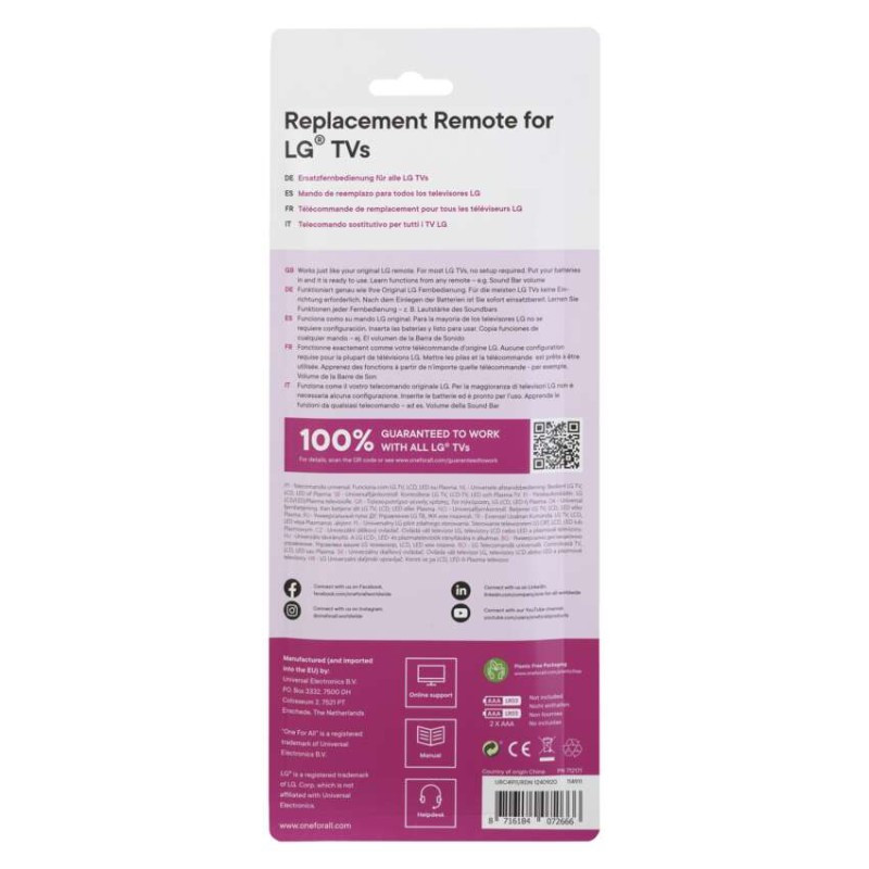a következő termékekhez tervezett: LG TV és audio berendezések|a lehetséges vezérelt készülékek száma: 2|az összes márka támogatott: nincs megadva|beállítás és frissítés a www.simpleset.com oldalon keresztül: nincs megadva|egyszeri (Simple set) beállítások: igen – audio eszközök|elem a távirányítóba (tartozék): nem|előreprogramozott kódok: igen|értékesítési csomagolás: 1 db, kis papír doboz|gyors hozzáférést biztosít kedvenc alkalmazásához: igen|hangerő zár: nem|hatótávolság: 15 m|háttérvilágítású billentyűzet: nem|készülék közvetlen kiválasztása: nem|kód keresés: kód utánállítása az adott LG sorozathoz|kód megjegyzése az elem eltávolítása után: igen|kombi vezérlésmód: nem|közvetlen kód beállítás: nem|makró funkció: igen|méretek: 25 × 44 × 195 mm|modell sorozat: speciális TV|súly: 90 g|szerviz frissítés: igen|tanulási funkció: igen|táplálás: 2× AAA|vezérlőgomb beállításának módosítása: nem