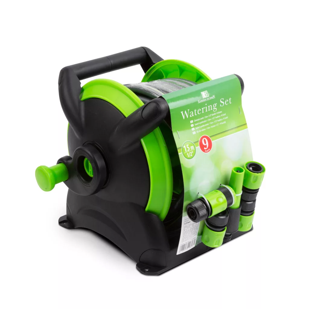 Ez a kerti öntözőszett a legtöbb háztartás igényét tökéletesen kielégíti. A szett tartalma a 15 méter hosszú slagon és tárolódobon kívül, a kényelmes használatot biztosító locsoló sugárcső, csapcsatlakozó és tömlőcsatlakozók (gyorscsatlakozók). A dob, kompakt méretének köszönhetően könnyen hordozható, a gumitömítéssel rendelkező gyorscsatlakozó kuplung egyszerű csatlakozást biztosít már meglévő tömlőkre.