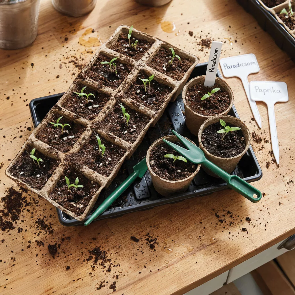 Tartalom: Tőzegcserepek, palántatálca, jelölők, ültetőpálcák