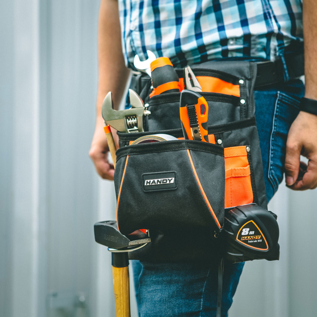 Különböző méretű zsebekkel rendelkező multifunkciós szerszámos övtáska, kalapácsakasztóval. Alkalmas lehet kisebb elektromos gépek, villáskulcsok, csavarhúzók, fogók és egyéb, akár éles szerszámok biztonságos tárolására. Vastag, vízlepergető, poliészter anyagból készült, a szegecselés kellő strapabíróságot biztosít.