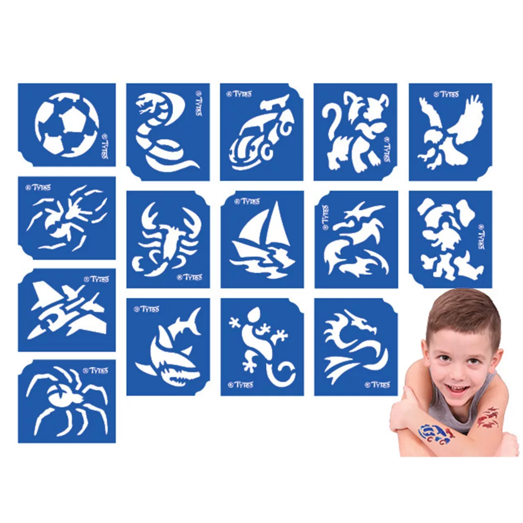 A csomagban található sablonok segítségével fiús csillámtetoválás mintákat készíthet, melyeket egyéb testfestéshez is felhasználhat. Ebben a csomagban olyan sablonokat talál, amiket nagyon szeretnek a fiúk. Olyan slágermintákat kap, mint a pók, járgányok, vagy hüllők biztos örömet szerznek a kisfiúknak.