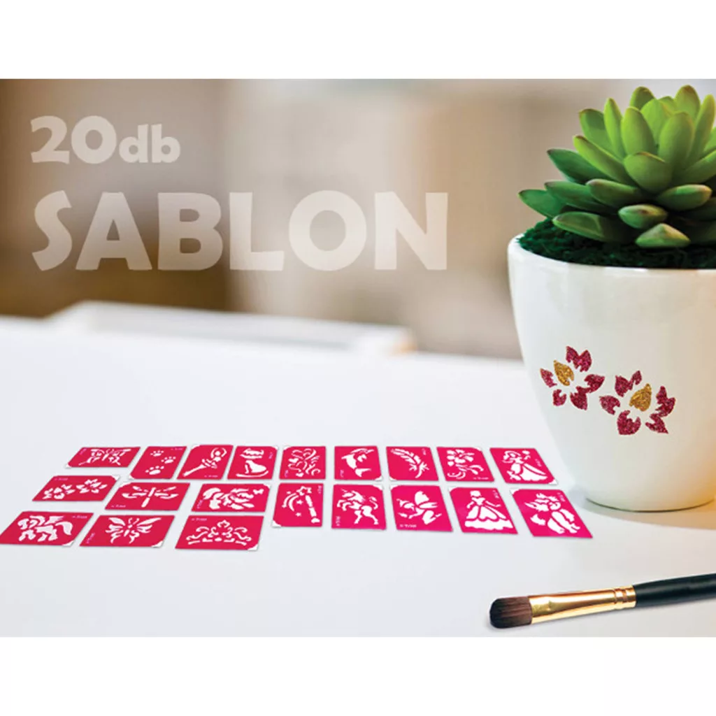 A sablon szett 21 db, 3-8 éves lányoknak készült mintát tartalmaz, melyeket használhat csillámtetováláshoz, vagy egyéb testfestéshez. Olyan slágermintákat kap egy csomagban, mint a cica, pillangó vagy póniló, melyek biztos örömet szereznek a kislányoknak.