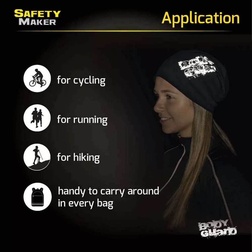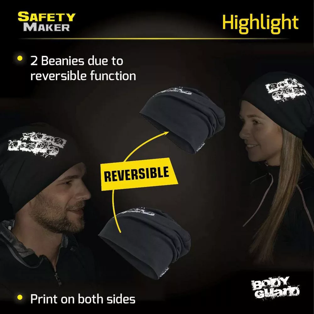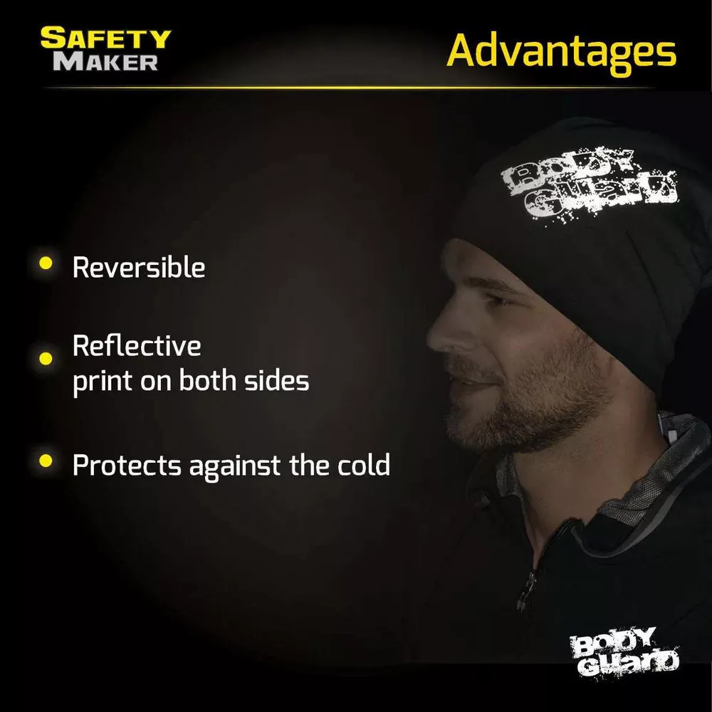 Ha sötétedéseben is szeret kint lenni, sportolni futni, sétálni, akkor két kritérium van, amelyek fontosak az Ön által viselt ruhák esetében: először is a láthatóság az úton és másodszor a hideg és a szél elleni védelem. A SafetyMaker sapka e két tulajdonság tökéletes kombinációját kínálja Önnek. A rendkívül fényvisszaverő Bodyguard nyomat a sapka mindkét oldalán láthatóvá tesz a többi közlekedő számára akár 70 méterről is – és ez életeket menthet egy kritikus helyzetben. Ezenkívül a sapka minden zsebben elfér, és mindig kéznél van, ha hidegre fordul, és melegen kell tartania a fülét és a fejét. Tehát nyugodtan kezdheti a napot, tudva, hogy minden eshetőségre felkészült.
